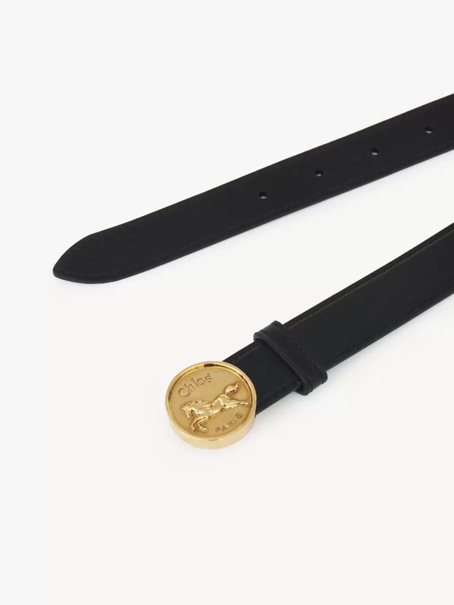 Chloé Horse Medal leather belt with a round medal buckle featuring a debossed galloping horse rooted in the Maison’s DNA. A Chloé Paris logo engraving signs this adjustable belt.