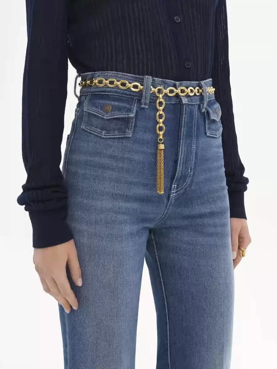 Chloé Pompoms jewelry belt in vintage gold brass. The adjustable chain features a meticulously hand-assembled chain tassel. A Chloé logo engraving finishes this piece. Adjust the chain to wear the belt high on the waist or low on the hips, depending on your silhouette.