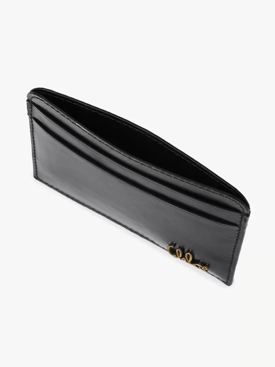 Crafted from shiny calfskin, the Chloé Iconic card holder combines a minimalist design with a metallic signature from the Maison’s archives.