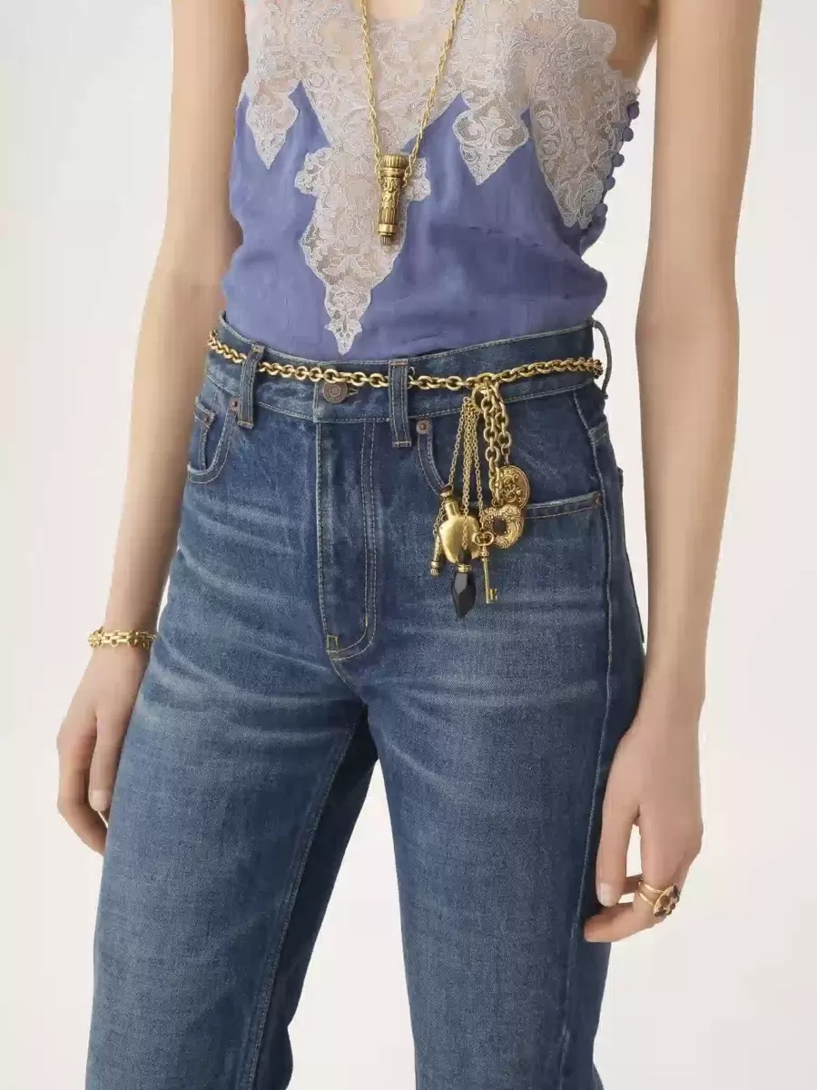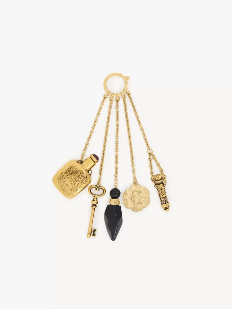 Château Treasures charm in vintage gold brass and resin, featuring five pendants set on dangling chains: three different vials, a key and a floral “C”. A Chloé logo engraving signs various charms.