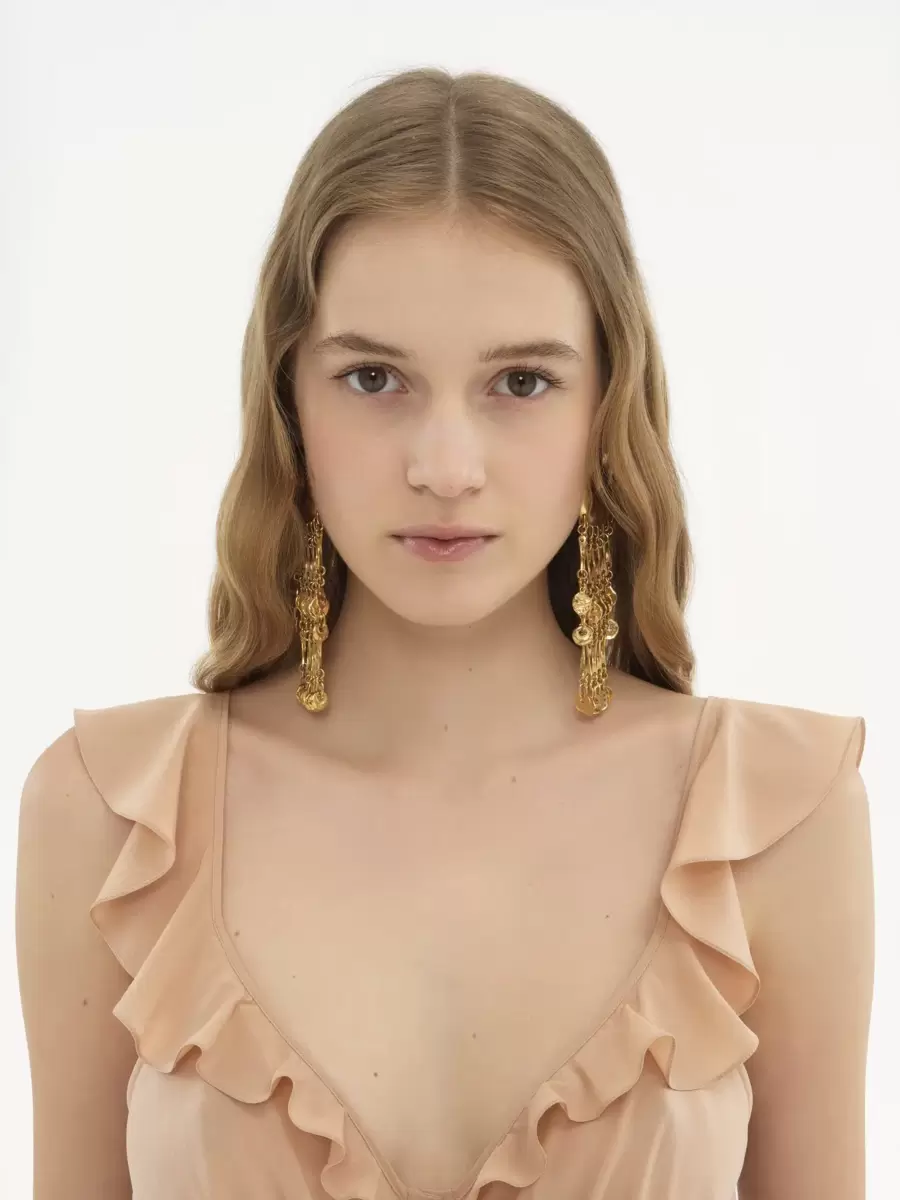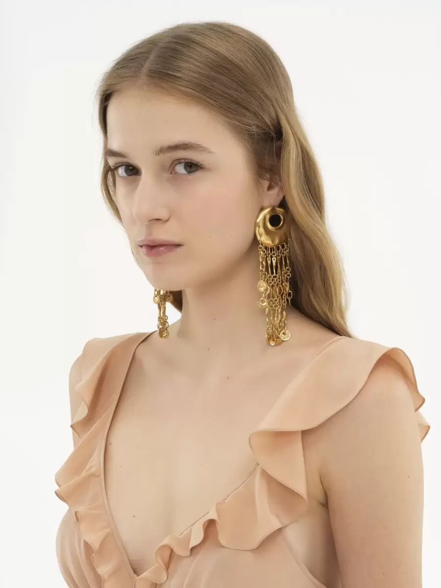 Chloé Eclectic dangling earrings in vintage gold brass. Smooth and hammered textures come together in a bold silhouette with dangling petal-inspired pendants. A Chloé logo engraving finishes these earrings.