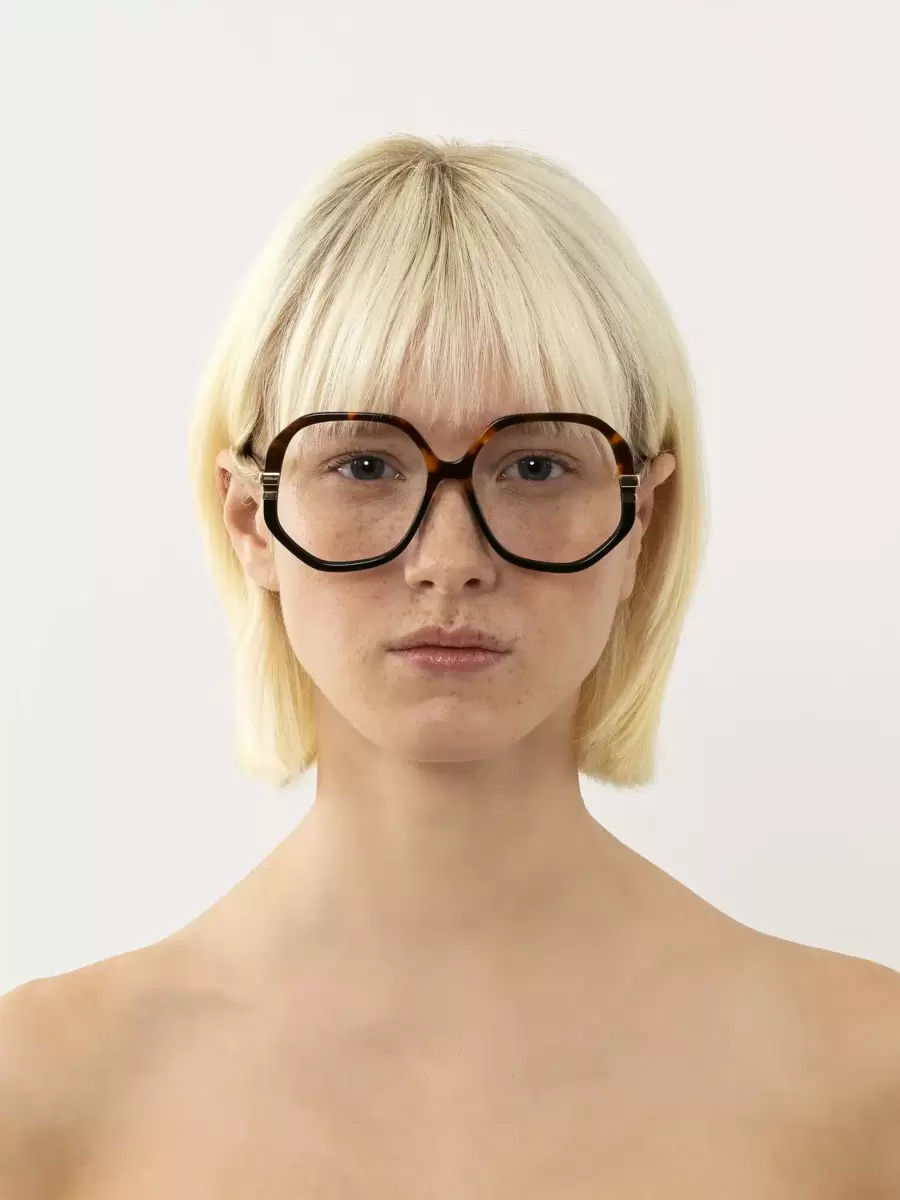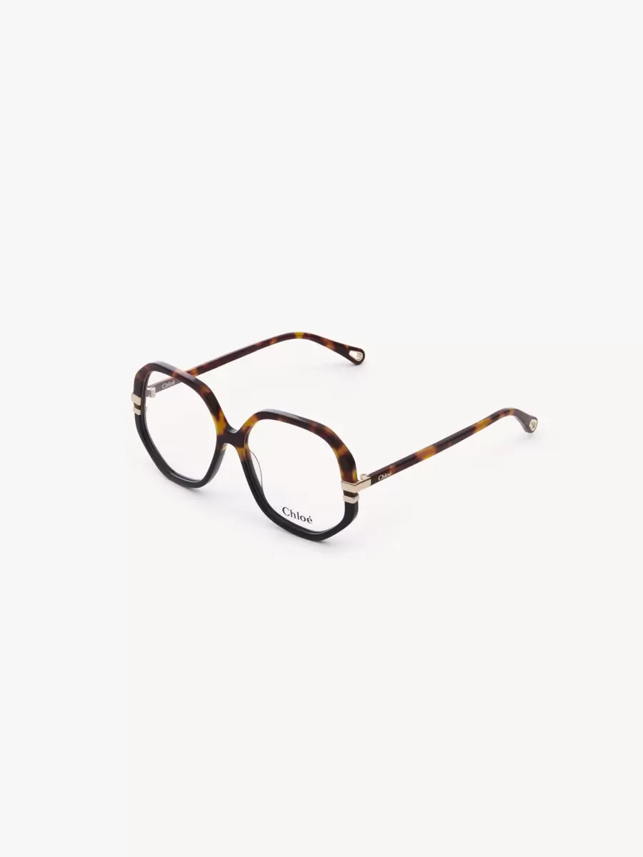 These eyeglasses have an acetate frame embellished with sophisticated metal inserts and include drop-shaped openings at the temple tips, making them compatible with Chloé’s eyewear jewelry.
