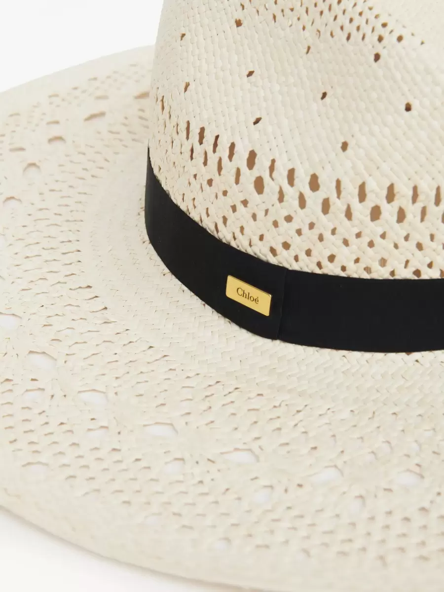 Chloé Panama hat in toquilla palm straw with lace-effect perforations. A contrasting silk ribbon contours the base, signed by a gold-tone Chloé logo plate.