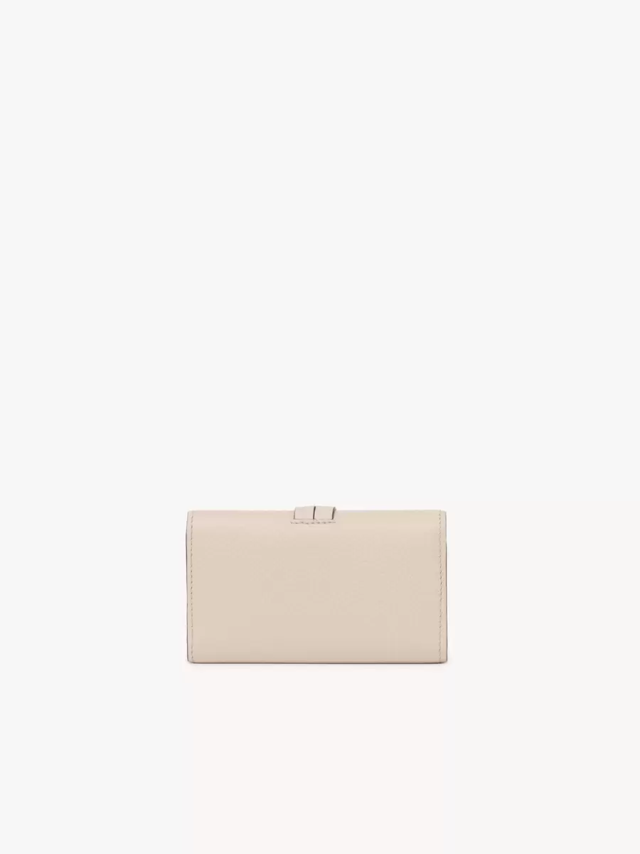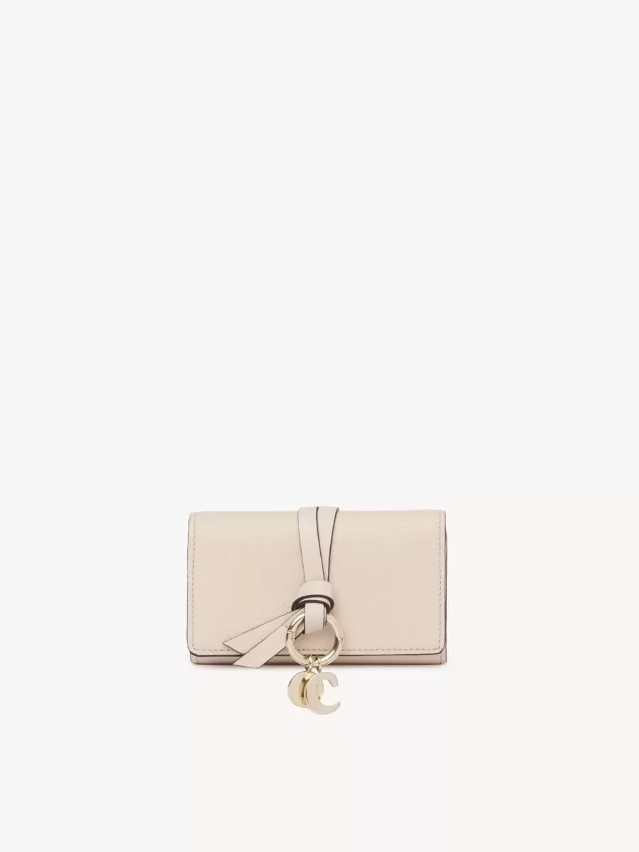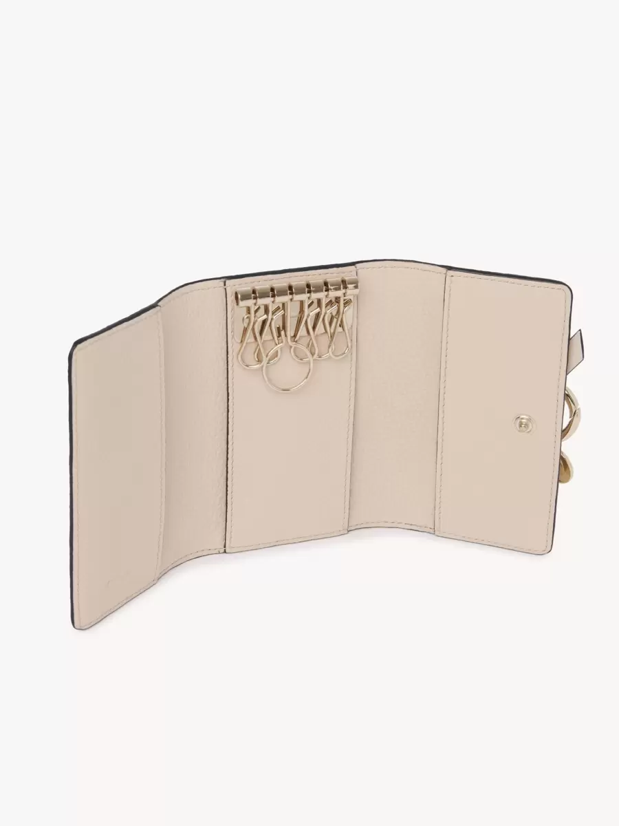 The Maison’s iconic Alphabet line includes this key case in grained and shiny calfskin. A practical accessory, it features multiple keyrings and two card slots. The front is finished with a knotted link and Chloé-designed golden initial charms.