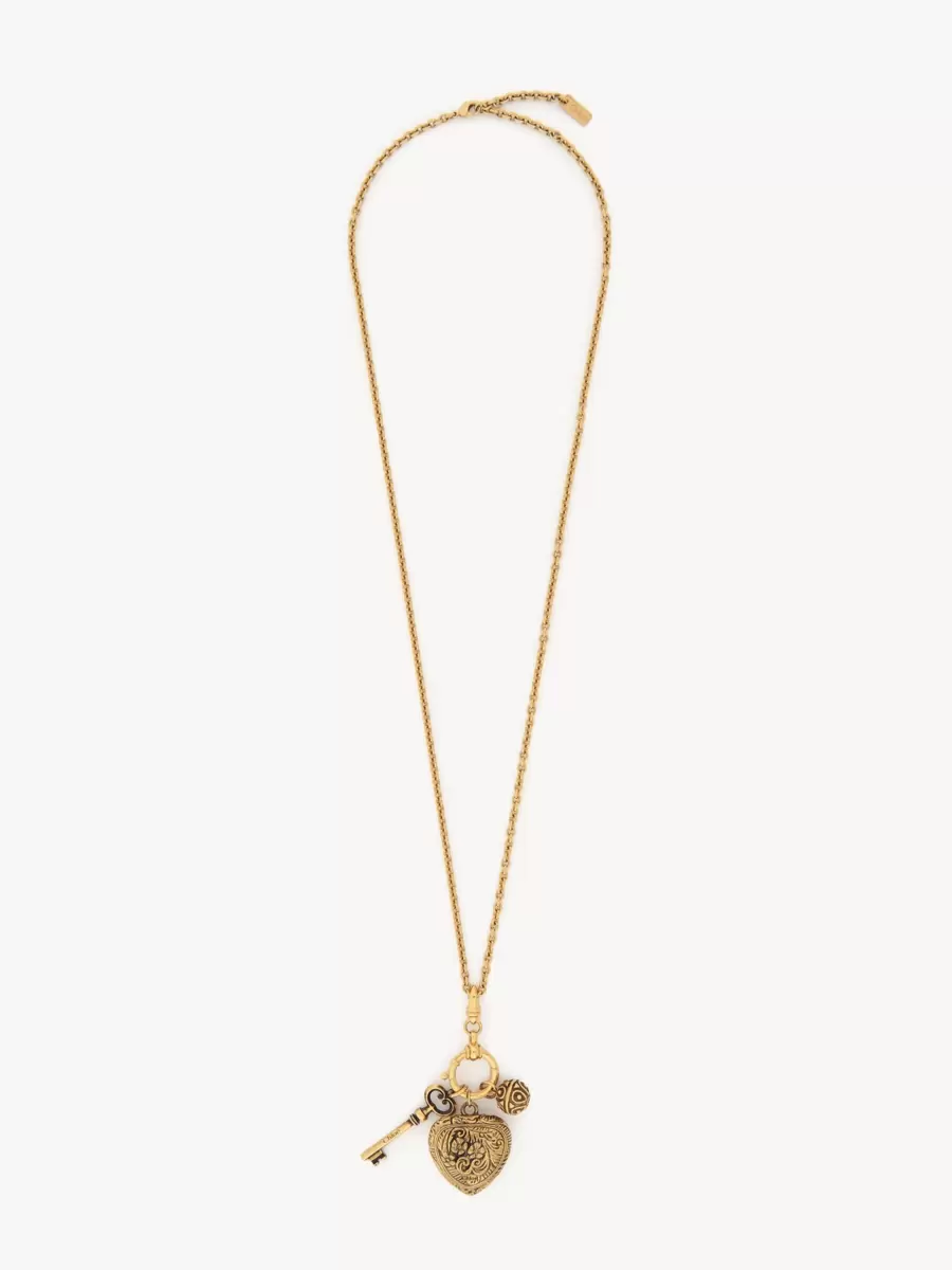 Château Treasures pendant necklace in vintage gold brass, featuring three charms set on a central ring: an ornamental heart and sphere, along with a key. Chloé logo engravings and a gold-tone Chloé logo plate sign the chain.