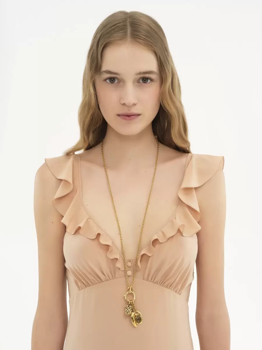 Chloé Charms pendant necklace in vintage gold brass. The chain can be worn in a single or double layer, while a ring is set with three pendants rooted in the Maison’s heritage: a pineapple, a banana and a petal. A Chloé logo tag signs this piece.