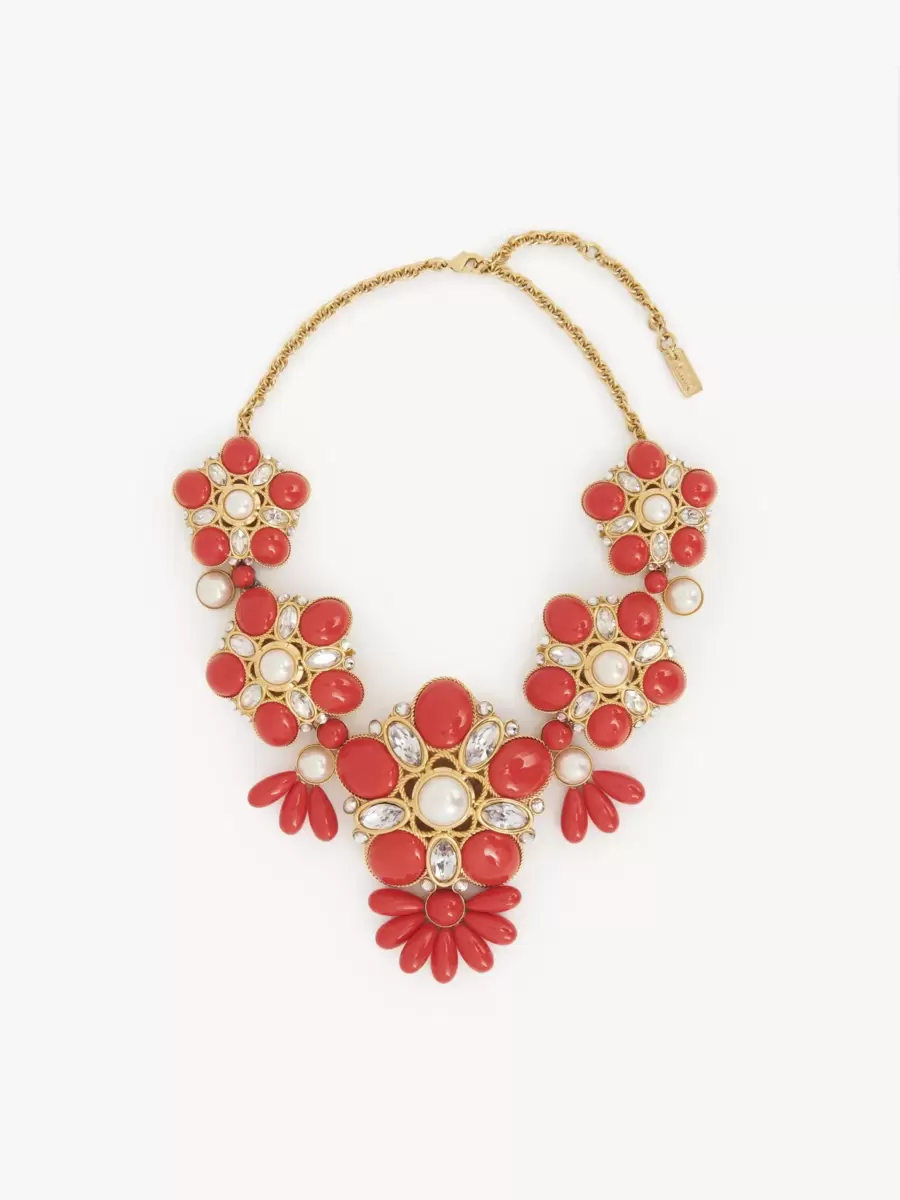 Chloé Magnificent necklace in meticulously cut vintage gold brass. Ornamental flowers in varying sizes are suspended from a fine chain, embellished with inlaid red resin, resin pearls and crystal glass. A gold-tone Chloé logo plate signs this piece.