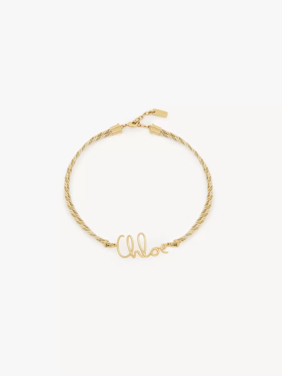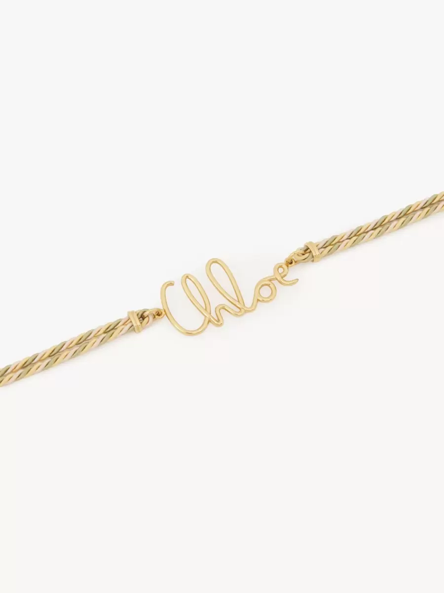 Chloé Plage necklace combining a double cotton-viscose braid in pastel tones with gold brass hardware. Inspired by the Maison’s heritage, the Chloé Iconic signature adorns the center. A gold-tone Chloé logo plate finishes this adjustable necklace.