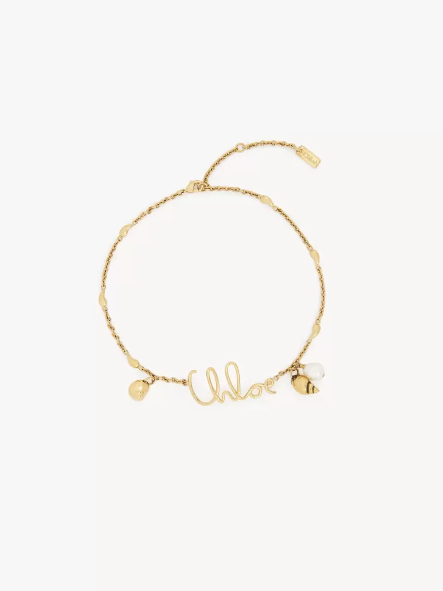 Chloé Shells necklace in vintage gold brass. Inspired by a heritage chain belt, the Chloé Iconic signature is combined with accent embellishments all around the chain, nodding to the “é” in Chloé. Shell pendants in gold brass and synthetic pearl round off the necklace, signed by a Chloé logo plate.