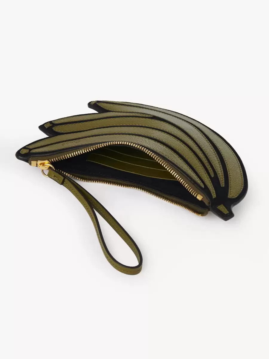 Crafted from shiny grained calfskin, this Banana flat pouch reveals a playful textured design inspired by the Maison’s Spring 2001 collection.