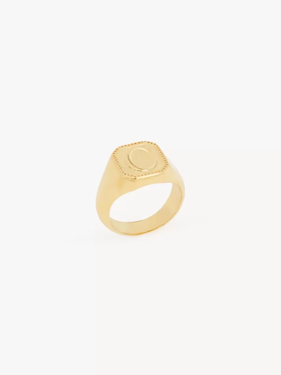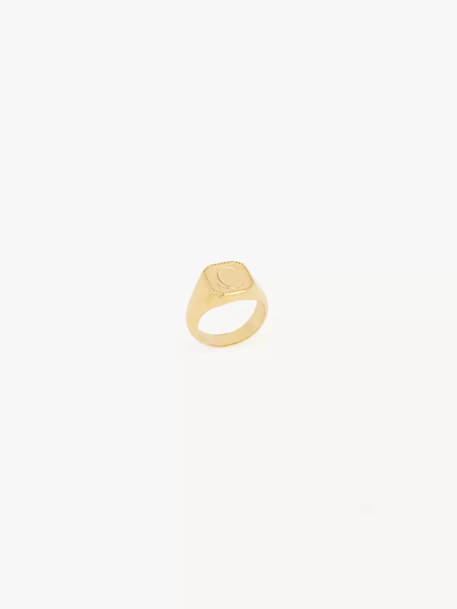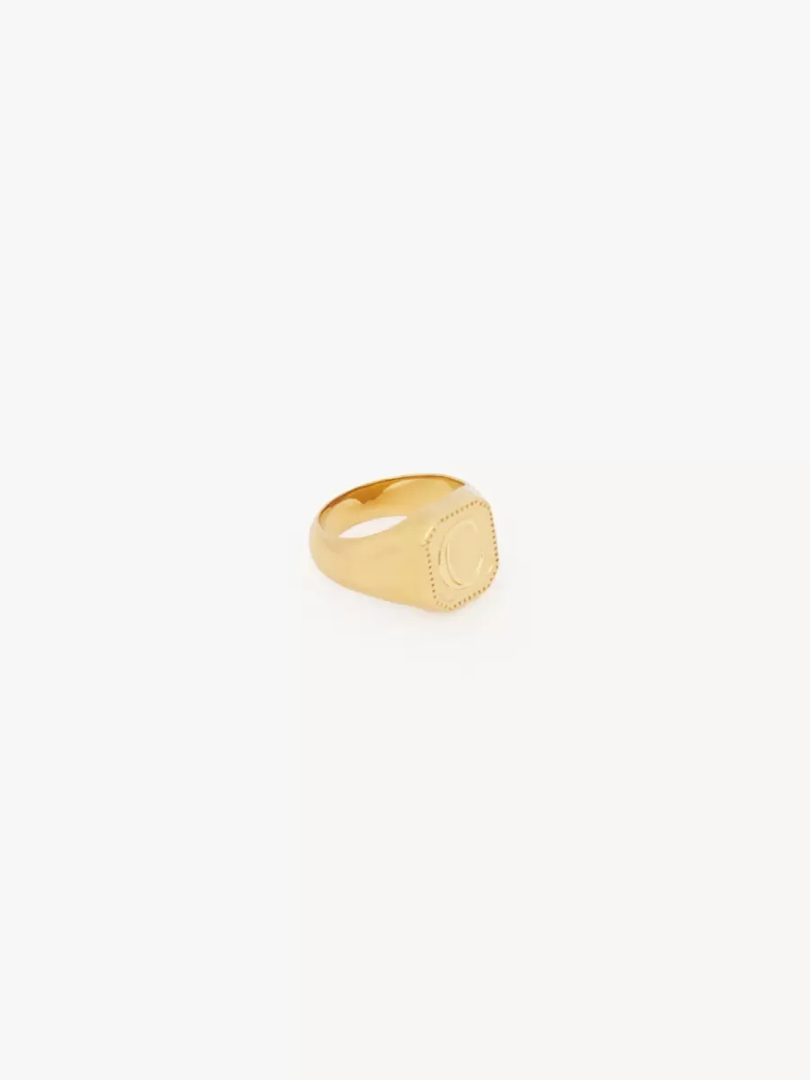 Chloé Charms ring in vintage gold brass. Contoured by lace-effect detail, the signature “C” is rooted in the Maison’s heritage. A Chloé logo engraving signs this piece.