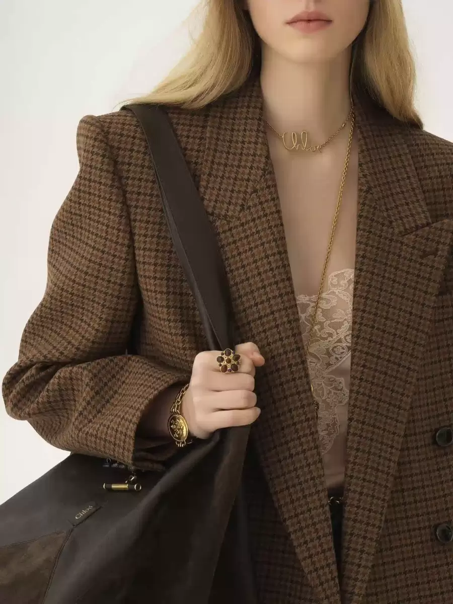 Chloé Eternity ring in gold brass, depicting a large, ornamental flower embellished with colored resin and brown obsidian studs. The double band is open at the back. A Chloé logo engraving signs this piece.