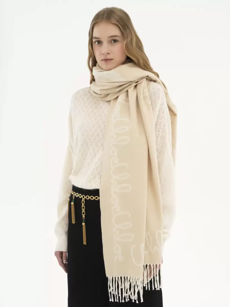 Chloé Iconic scarf in jacquard wool, detailed with fringed ends. Inspired by a chain belt rooted in the Maison’s heritage, a subtly contrasting jacquard Chloé signature adorns the center and borders.