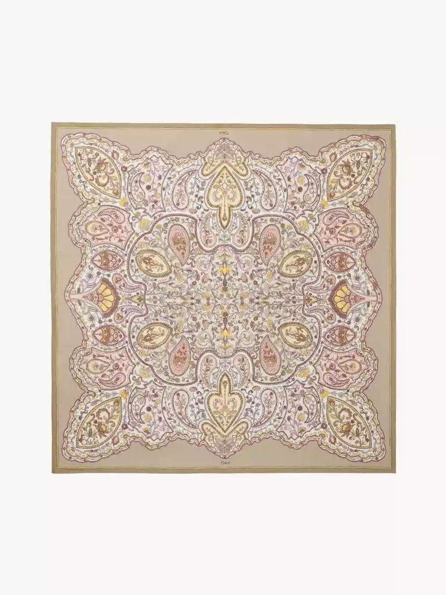Square scarf in organic silk twill with an inkjet-printed paisley motif. A plain frame, hand-rolled edges and a subtle Chloé logo print finish this printed scarf.