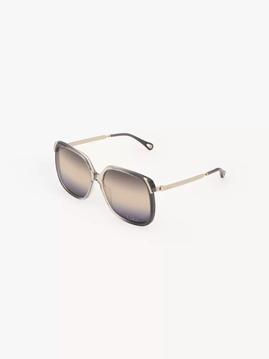These Aly square sunglasses have a 70s-style frame in a mix of gradient dark gray lower-impact acetate and shiny gold metal. The triple gradient lenses in blue, cream and blue are signed with the Chloé logo.