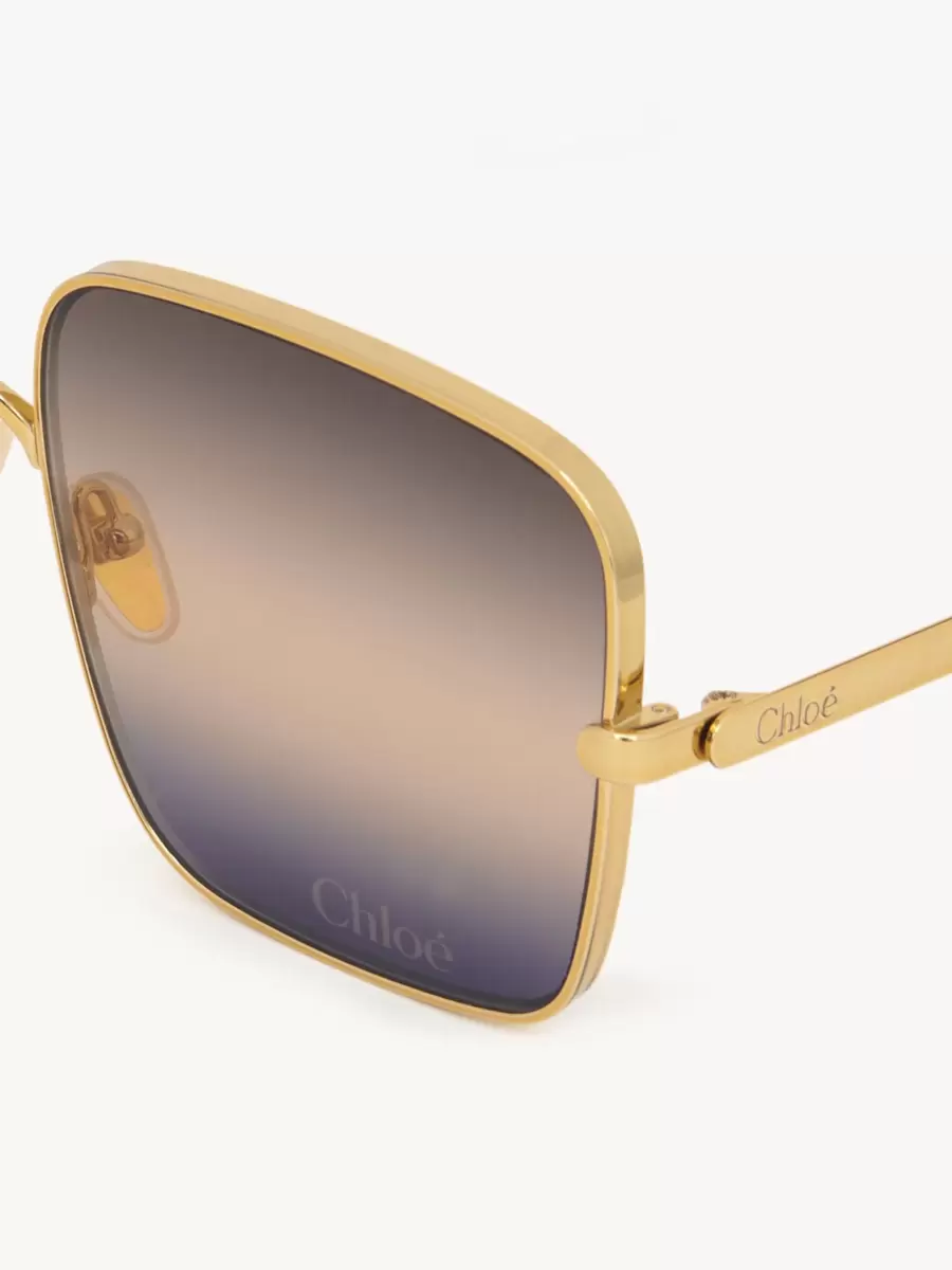 These Aly square sunglasses pair a thick graphic frame in shiny gold-tone metal with gradient beige to blue lenses. The Chloé logo finishes the left lens.