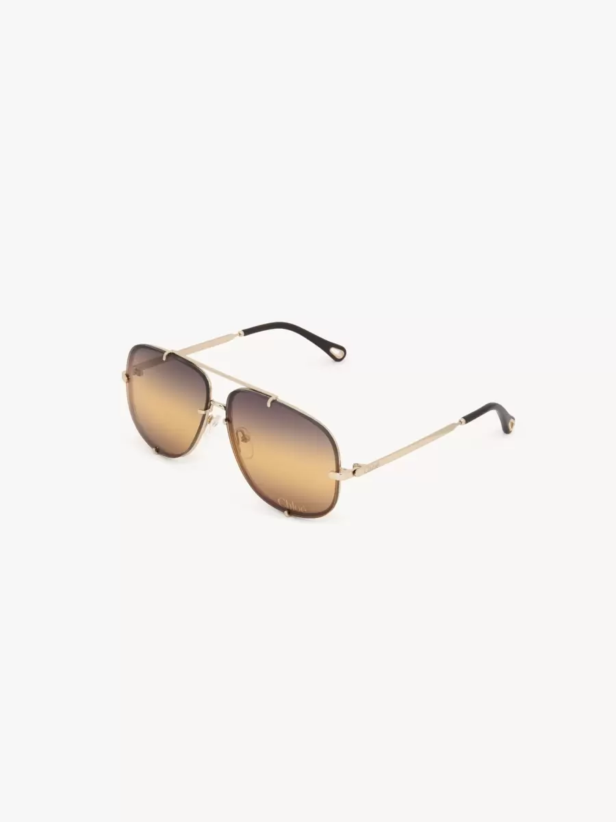 These Ivy aviator sunglasses pair a lightweight frame in shiny light gold metal with triple gradient blue to ocher lenses secured by metal hooks. A Chloé logo engraving signs the left lens and temples.