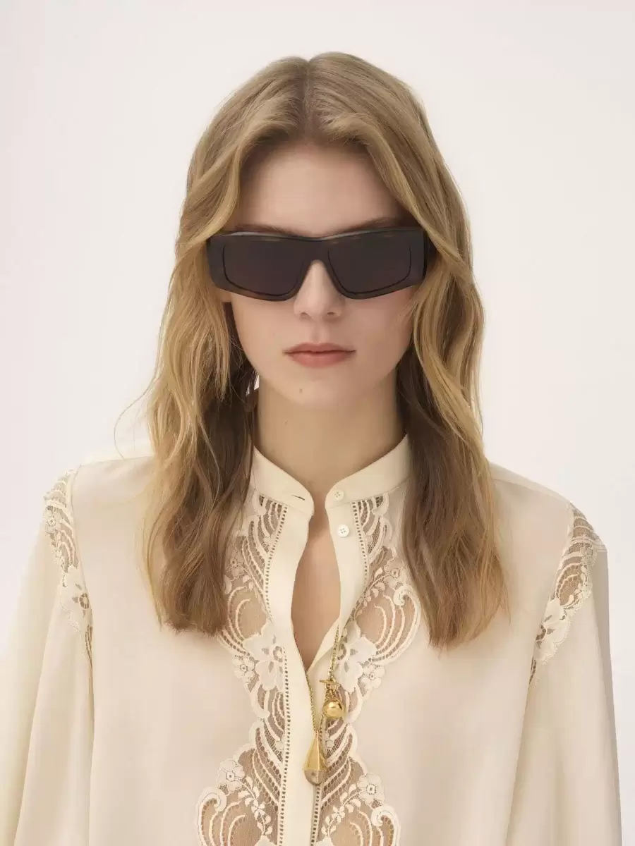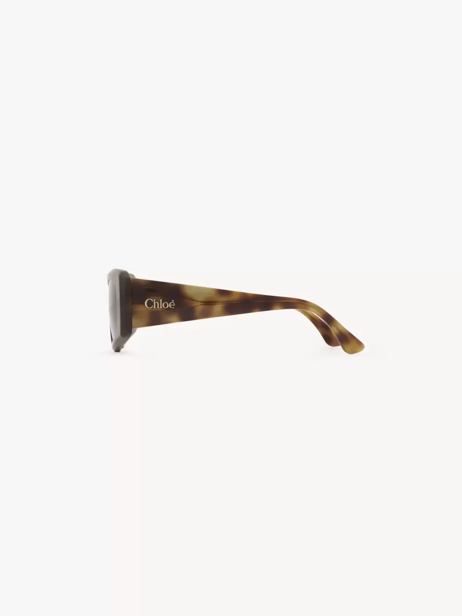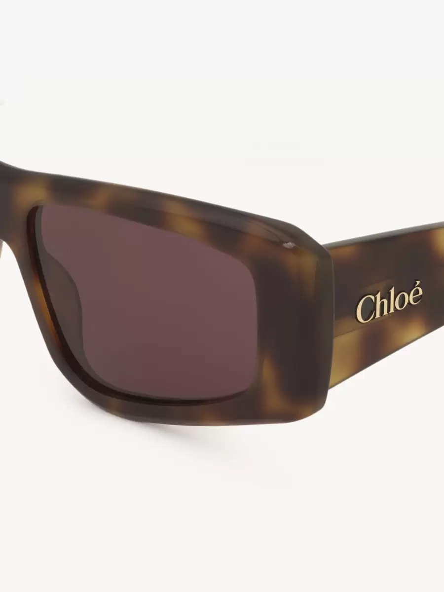 These Izia rectangular sunglasses pair a futuristic Havana beveled frame in thick lower-impact acetate with solid violet lenses. The tapered temples are signed with the gold-tone Chloé logo plate.