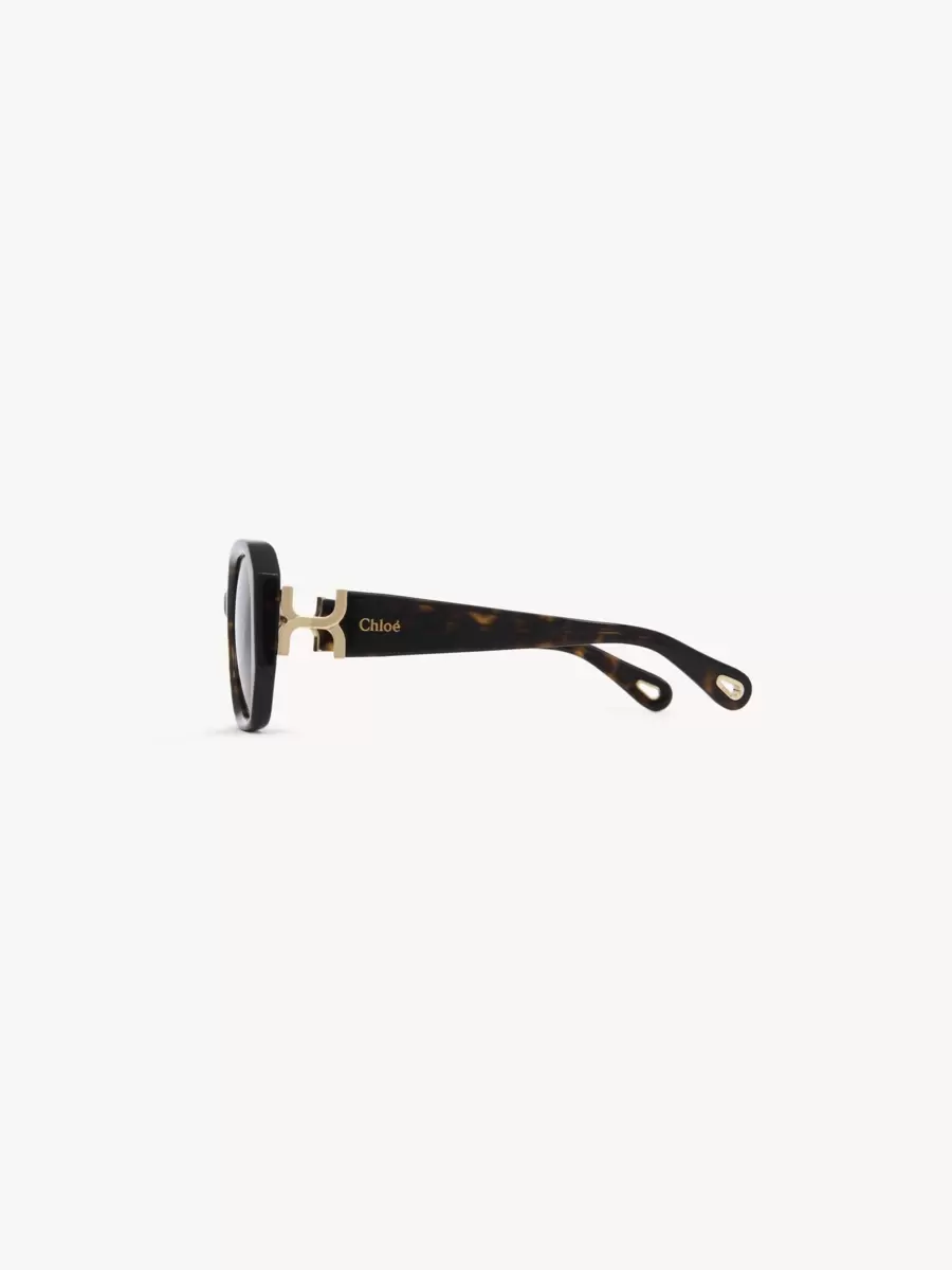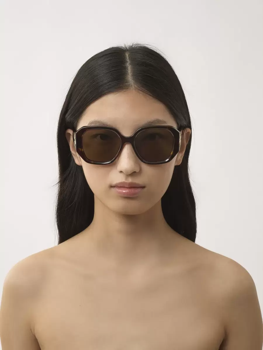 The glossy Dark Havana frame pairs with solid brown lenses in bio-based nylon for a timeless allure. The Chloé logo details the left temple while drop-shaped openings at the temple tips make these women’s sunglasses compatible with Chloé’s eyewear jewelry.