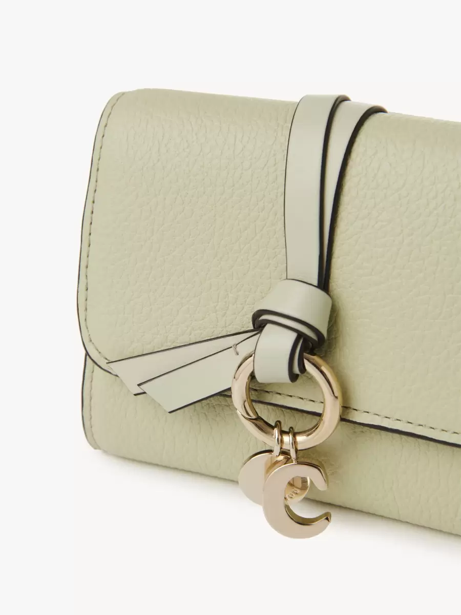 The Maison’s iconic Alphabet line includes this tri-fold wallet in grained and shiny calfskin. Designed to hold the essentials, it features multiple card slots and one flat pocket. The front is finished with a knotted link and Chloé-designed golden initial charms.