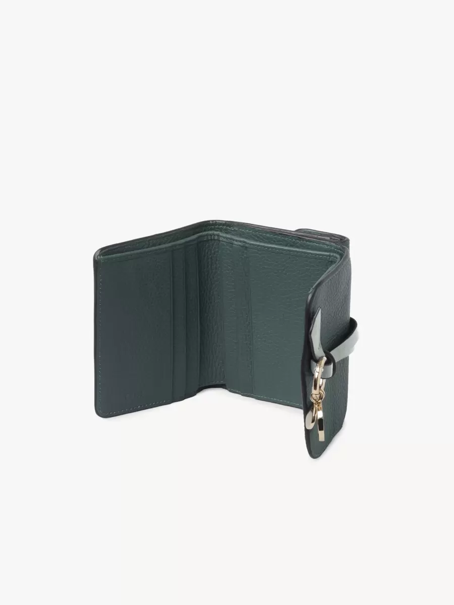 The Maison’s iconic Alphabet line includes this tri-fold wallet in bicolor grained and shiny calfskin. Designed to hold the essentials, it features multiple card slots and one flat pocket. The front is finished with a knotted link and Chloé-designed golden initial charms.