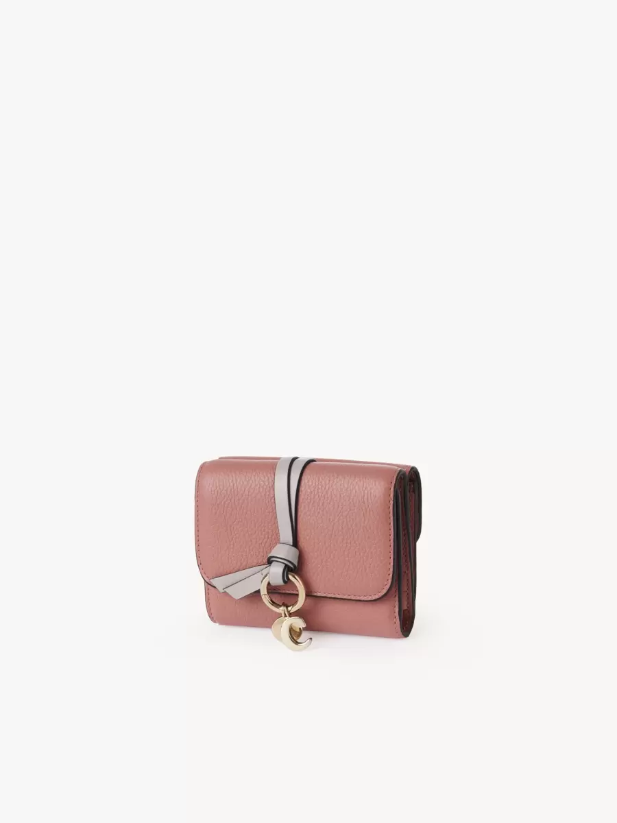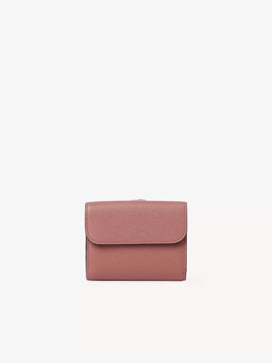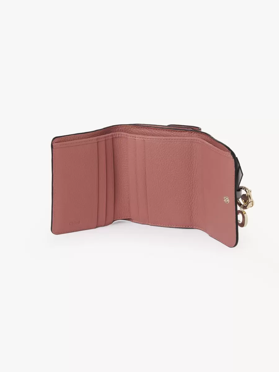 The Maison’s iconic Alphabet line includes this tri-fold wallet in grained and shiny calfskin. Designed to hold the essentials, it features multiple card slots and one flat pocket. The front is finished with a knotted link and Chloé-designed golden initial charms.
