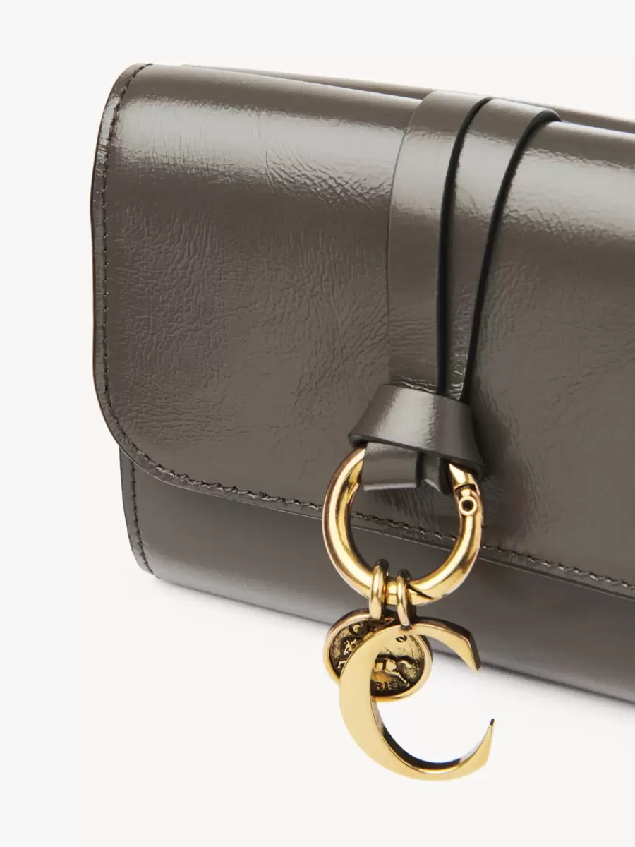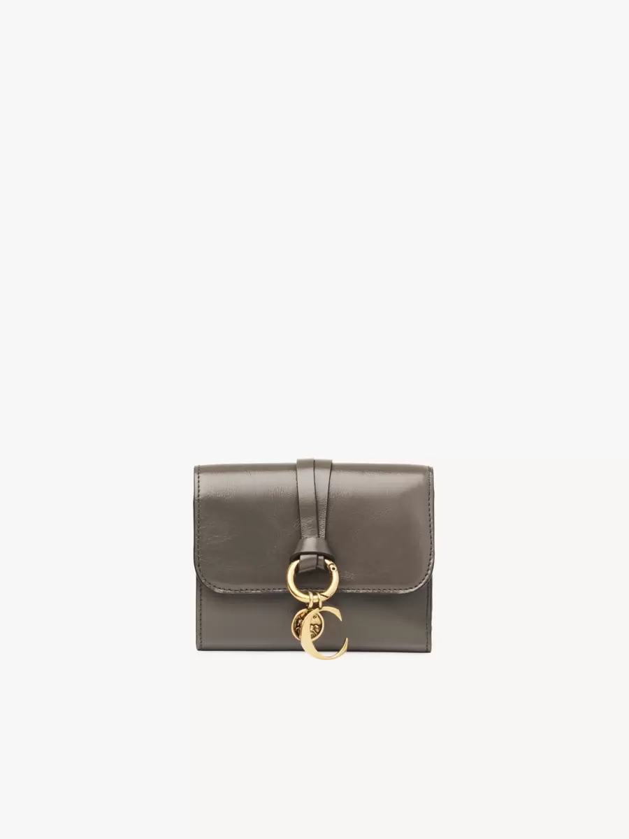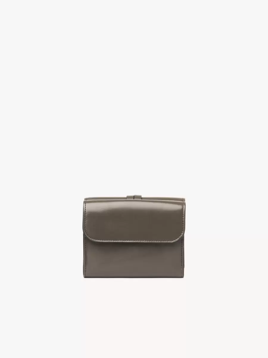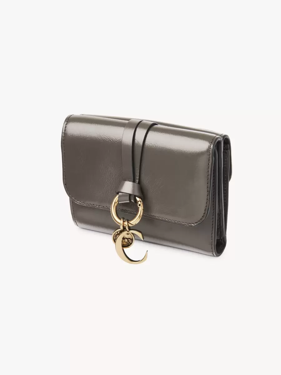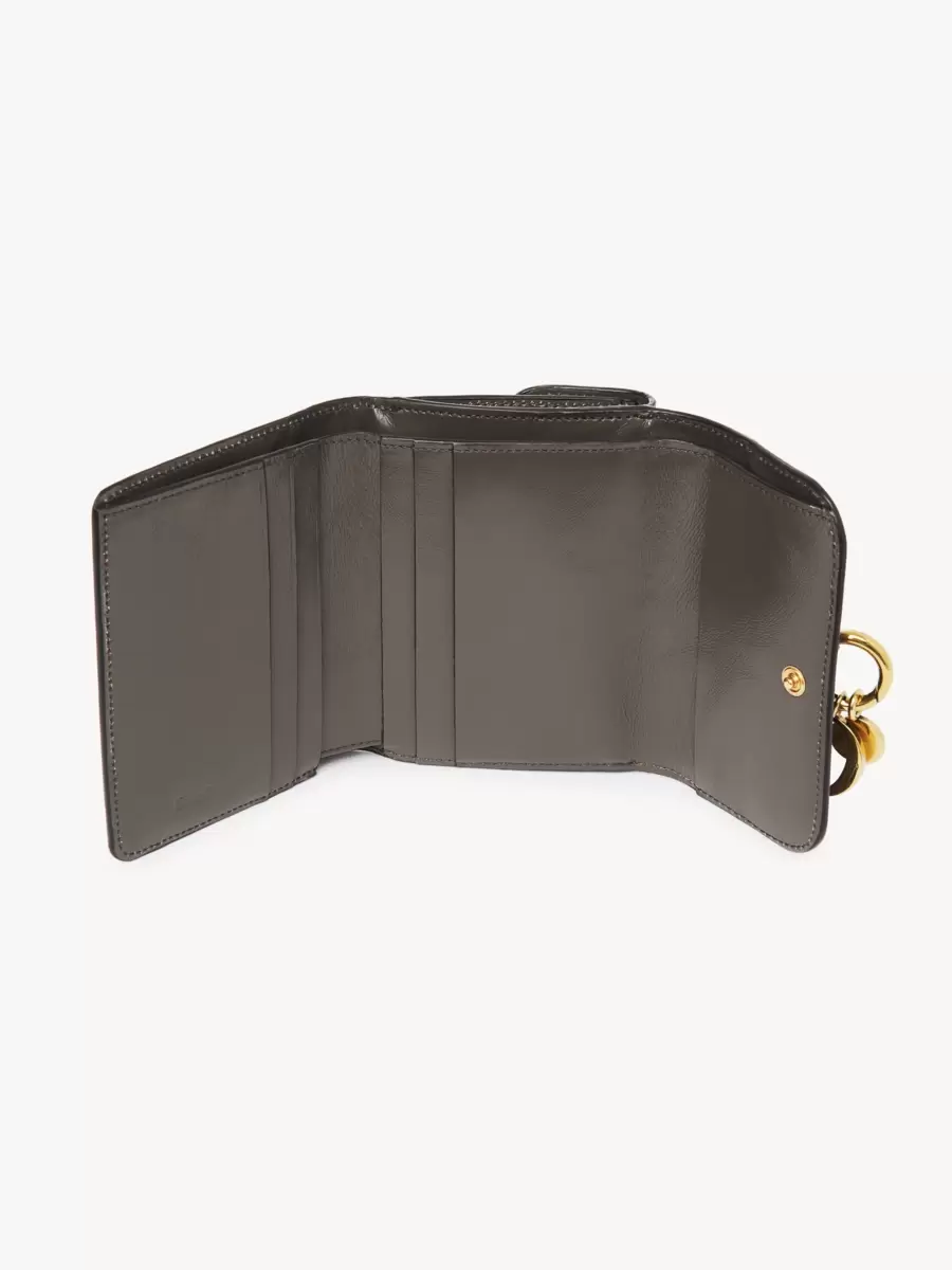 The Maison’s iconic Alphabet line includes this small tri-fold wallet in shiny calfskin. Designed to hold the essentials, it features multiple card slots and one flat pocket. The front is finished with a knotted link and Chloé’s signature golden initial and Horse Medal charms.