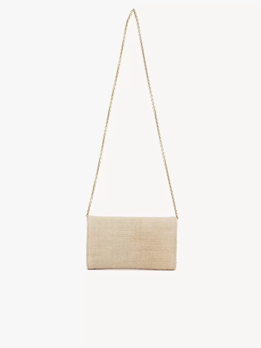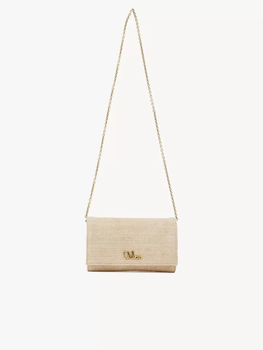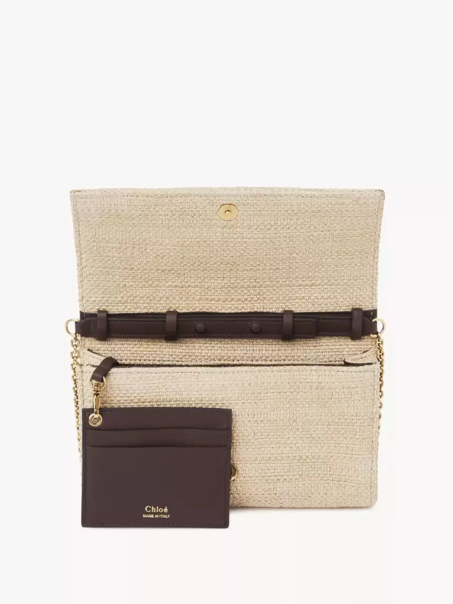 Crafted from raffia effect, this Chloé Iconic flap wallet on chain combines a minimalist silhouette with a metallic signature from the Maison’s archives.
