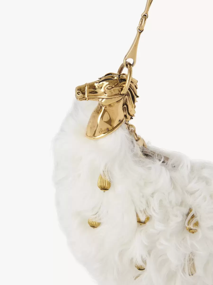 This Chain Horse shoulder bag is crafted from shearling in a minimalist silhouette elevated by intricate hand-embroidered golden beads. Inspired by the equestrian world, it is finished with the line’s gold-tone horse and a horsebit chain.