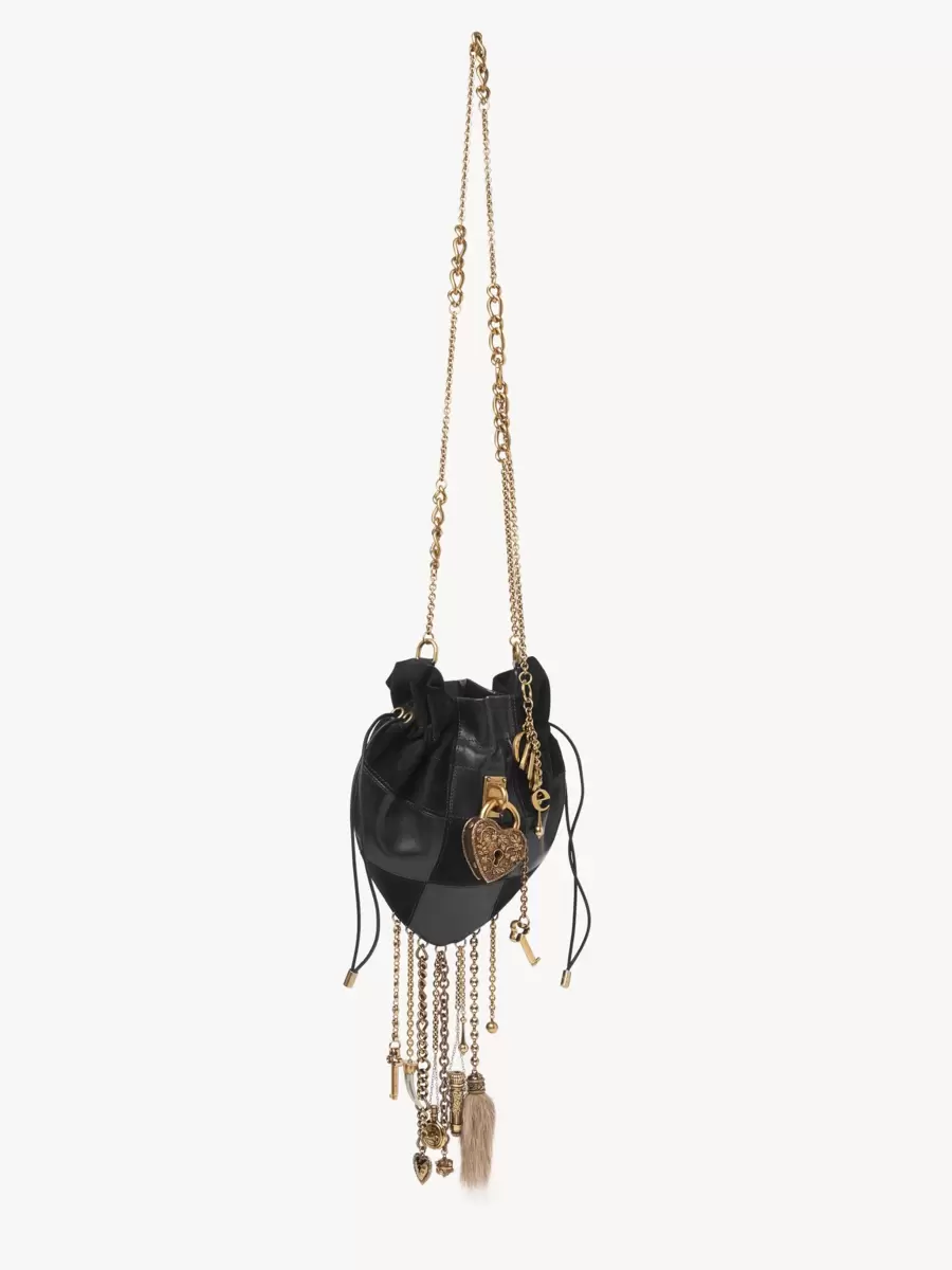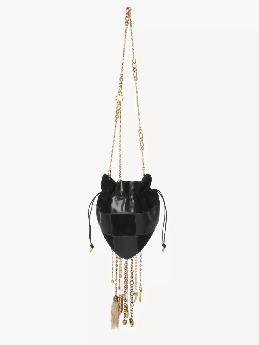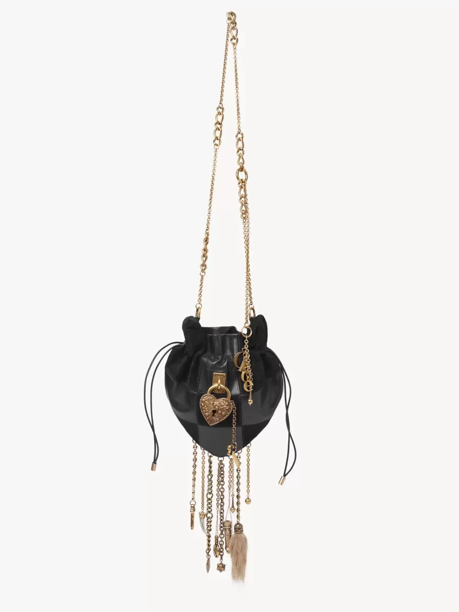 Crafted from a patchwork of suede goatskin and grained buffalo leather, the Château Treasures crossbody bag has a heart-shaped silhouette accentuated by a drawstring closure. An oversized ornamental heart padlock details the front while multiple charms in different sizes and textures dangle from chains at the base of the bag.