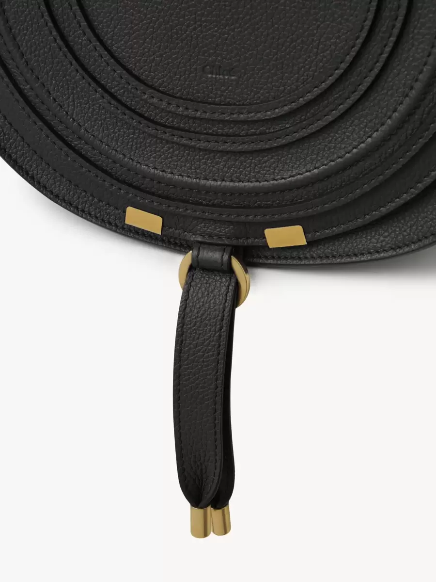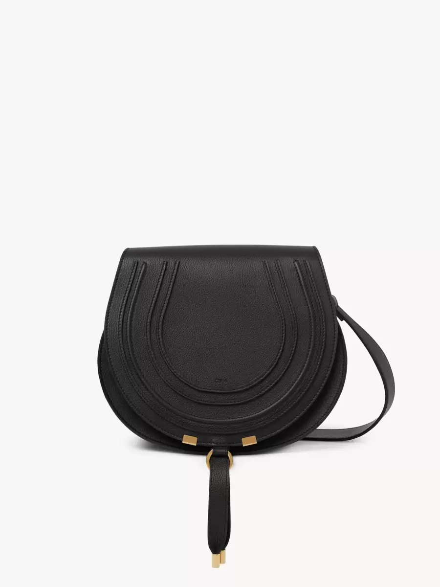 This Marcie saddle bag is crafted from grained calfskin with a rounded silhouette and a clean top line. The flap features the line’s iconic saddle stitching, secured with signature dangling leather tassels.