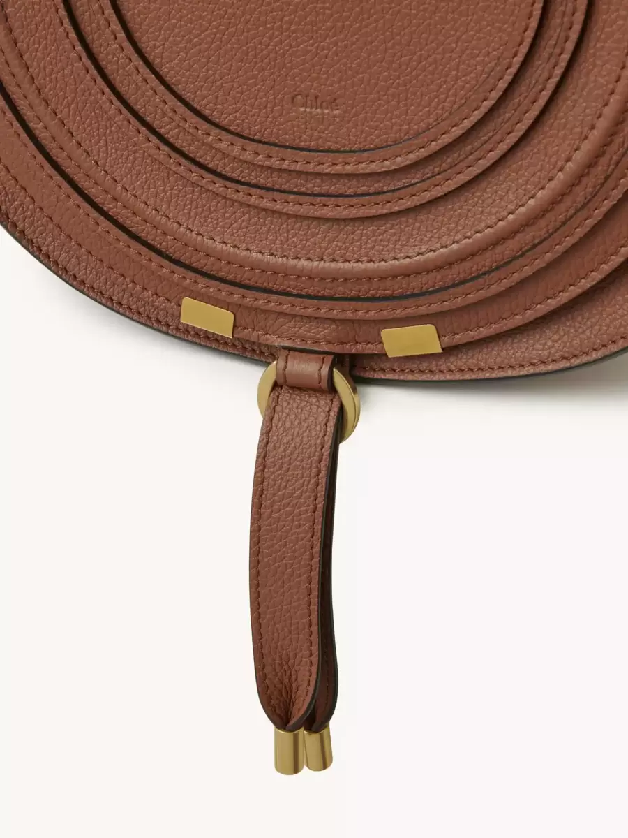 This Marcie saddle bag is crafted from grained calfskin with a rounded silhouette and a clean top line. The flap features the line’s iconic saddle stitching, secured with signature dangling leather tassels.