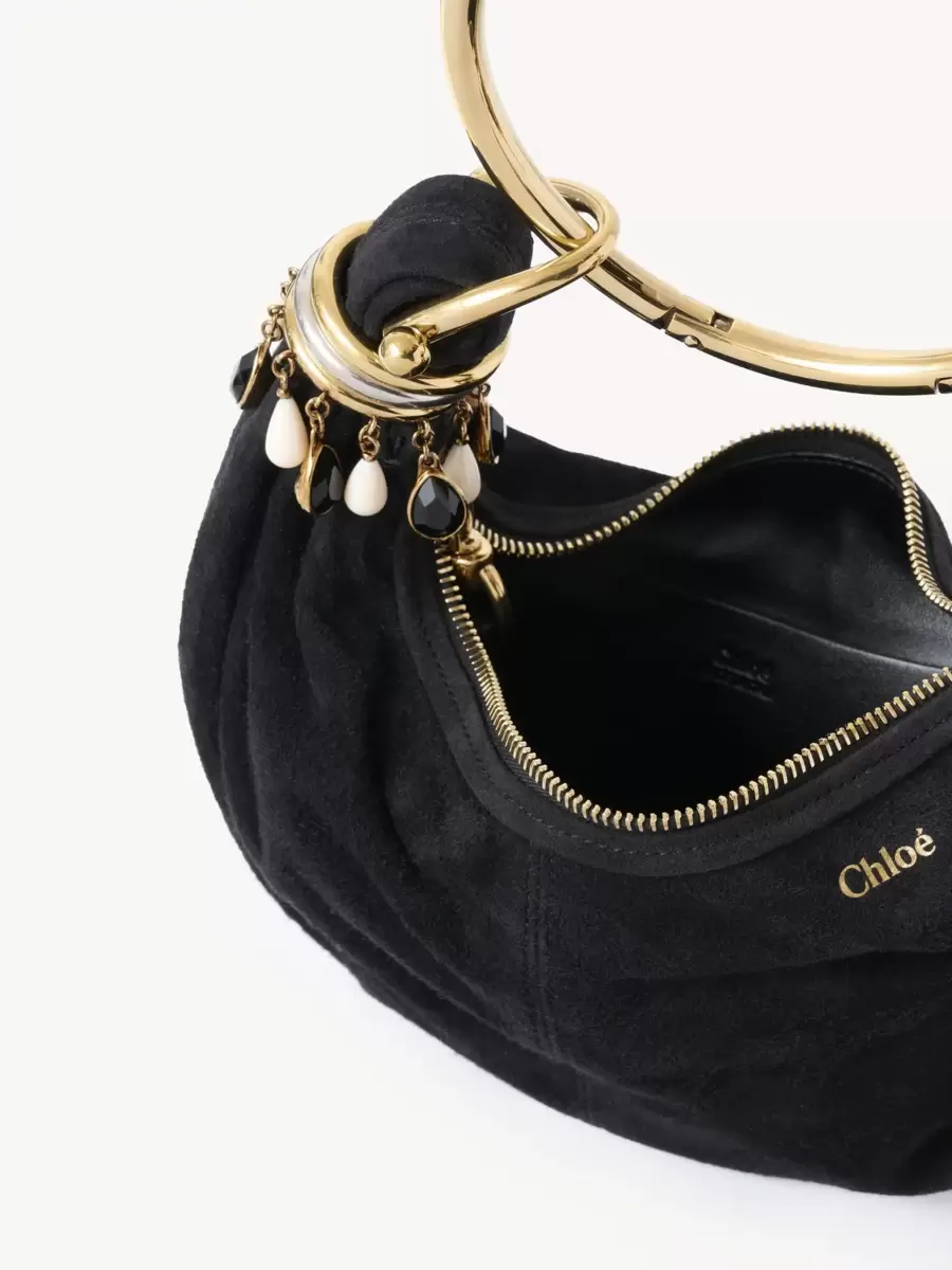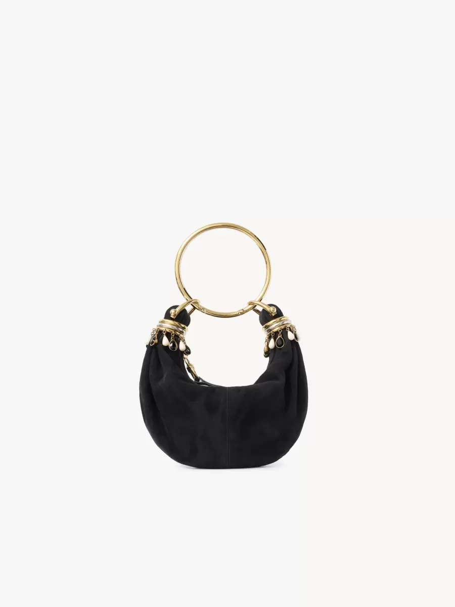 Inspired by the Maison’s Archives, this mini Bracelet Hobo bag is crafted from suede goatskin with a supple, rounded shape elevated by a bracelet handle. Stacked bi-color rings and dangling beads add jewelry embellishment.