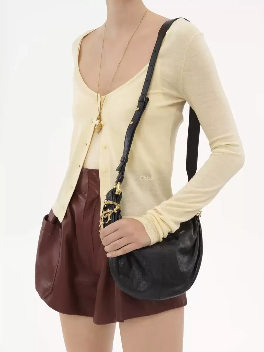 Inspired by the Maison’s Archives, this mini Bracelet Hobo bag is crafted from grained buffalo leather. The supple, rounded shape is elevated by a hammered bracelet handle, a golden coral charm and stacked bi-color rings.