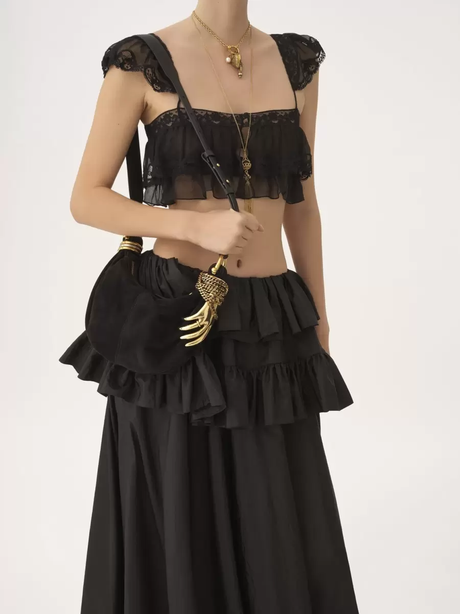 Inspired by the Maison’s Archives, this mini Bracelet Hobo bag is crafted from suede goatskin with a supple, rounded shape elevated by a bracelet handle. The ends feature jewelry embellishment with a metallic chain and hand ornament, and stacked rings.