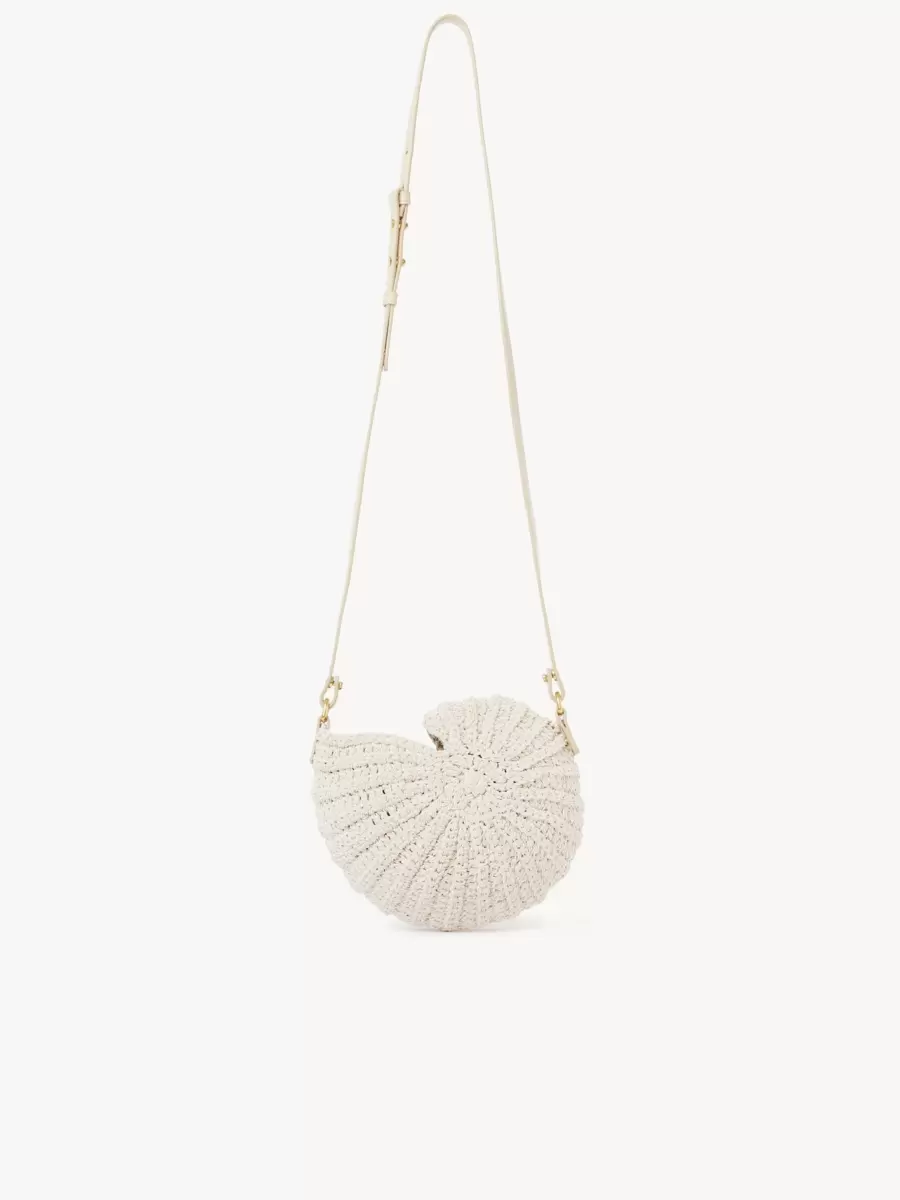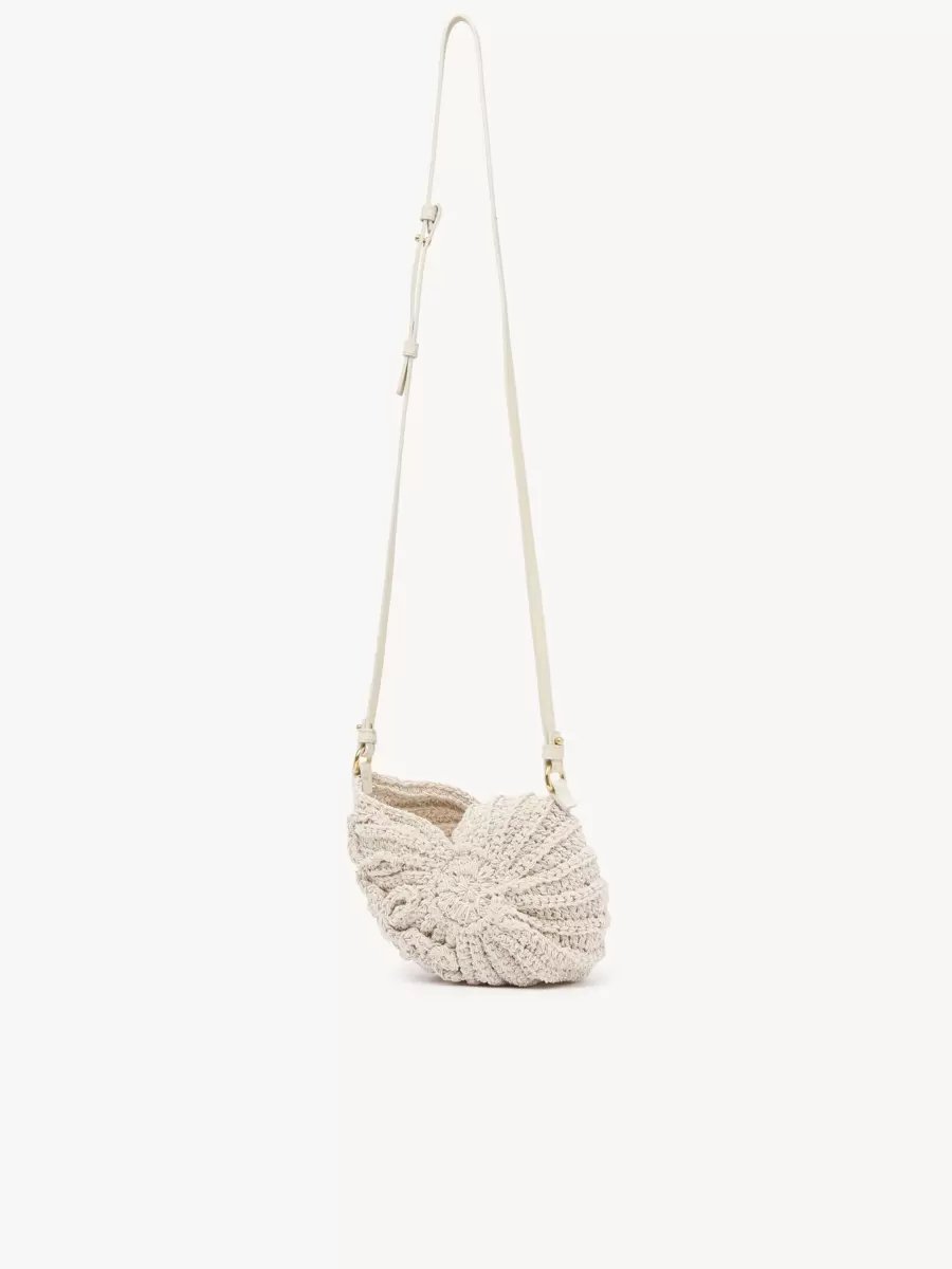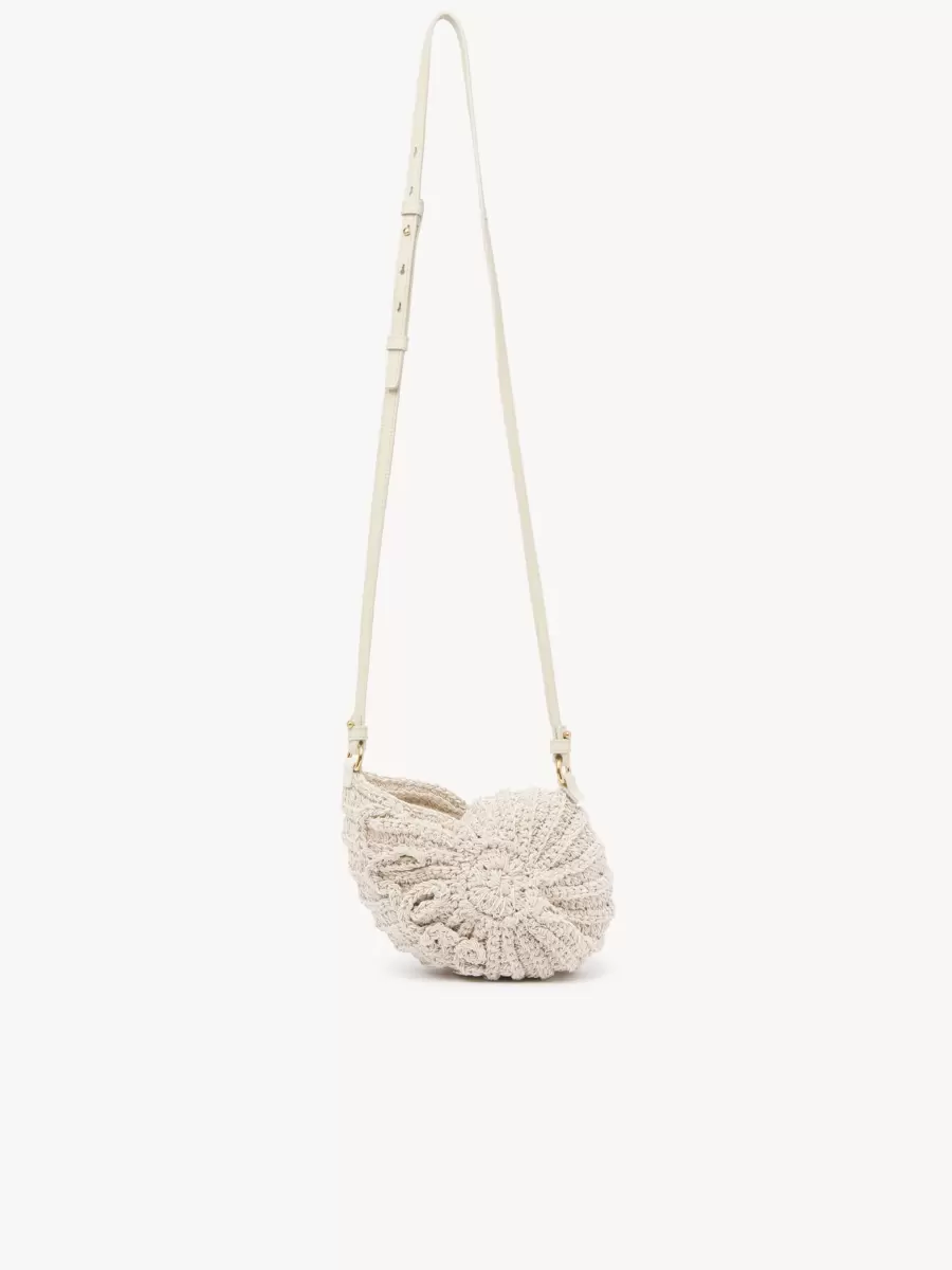 The Sea Treasures crossbody bag recreates a shell shape in crochet. The front features a tonal handwritten signature inspired by the Chloé heritage.