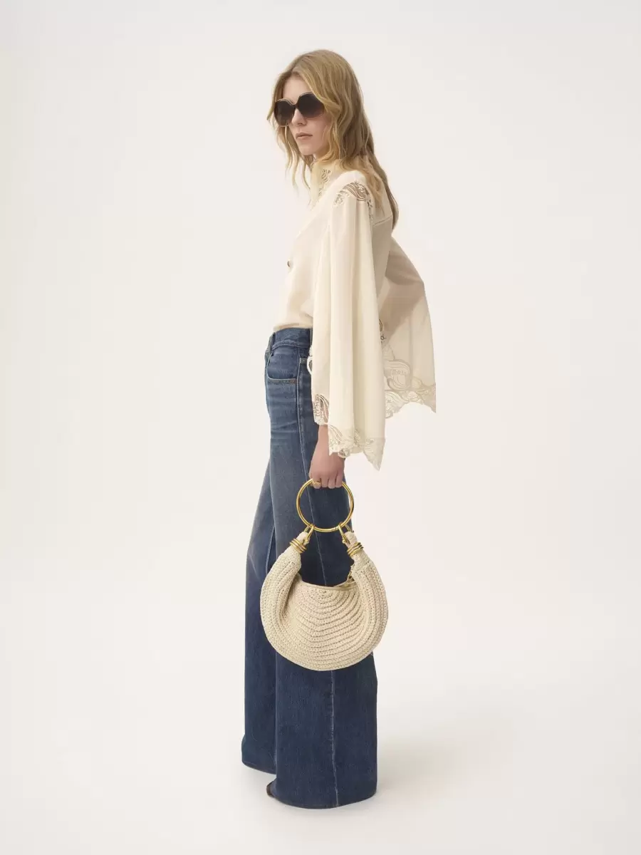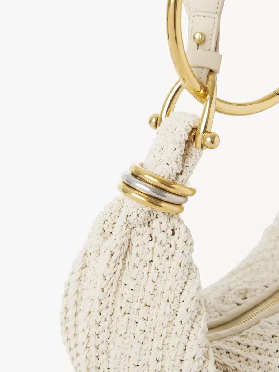 Inspired by the Maison’s Archives, this small Bracelet Hobo bag takes 8 hours to crochet by hand. The supple, rounded shape is elevated by a bracelet handle and stacked bi-color rings at the ends.
