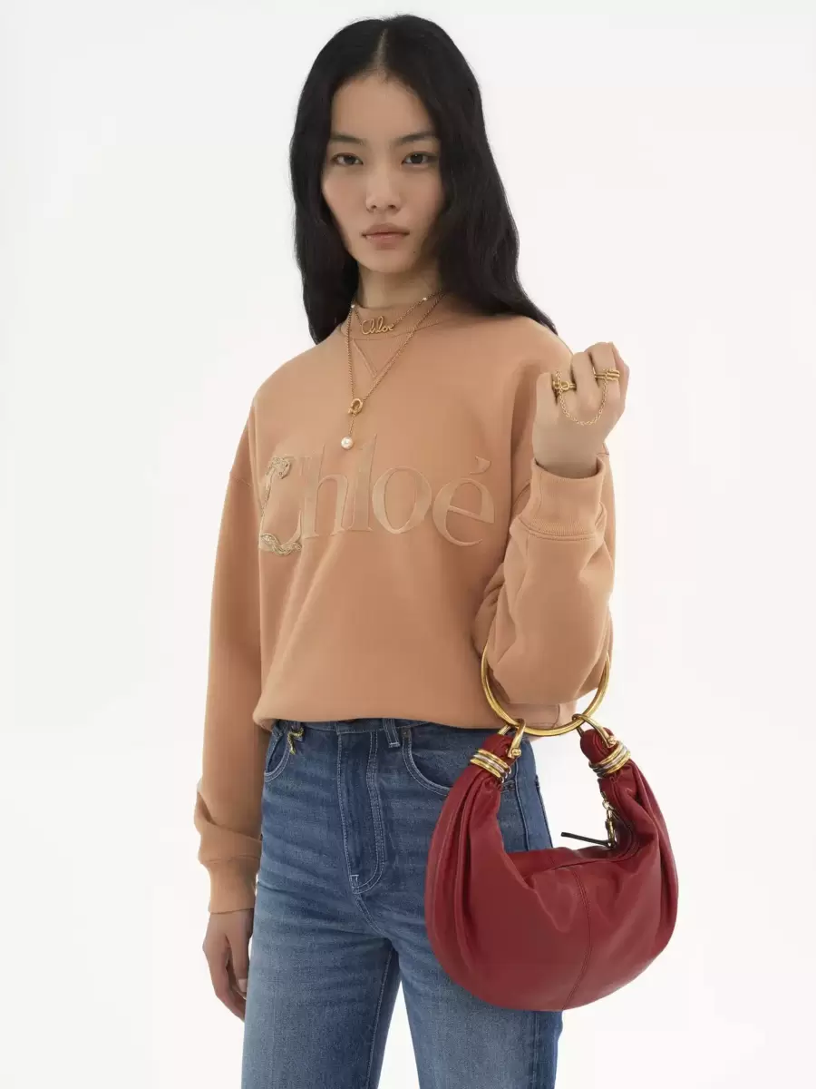 Inspired by the Maison’s Archives, this small Bracelet Hobo bag is crafted from shiny grained calfskin. The supple, rounded shape is elevated by a bracelet handle and stacked bi-color rings at the ends.
