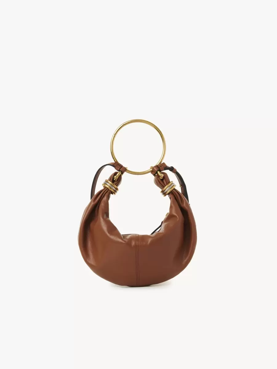 Inspired by the Maison’s Archives, this small Bracelet Hobo bag is crafted from shiny grained calfskin. The supple, rounded shape is elevated by a bracelet handle and stacked two-toned rings at the ends.