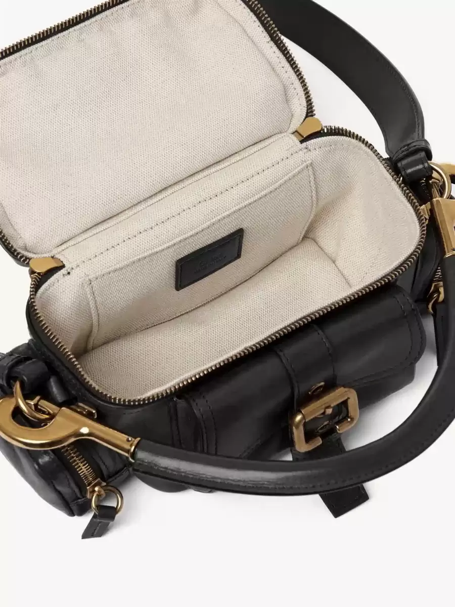 This small Camera bag is crafted from natural shiny buffalo leather. Its multiple pockets are embellished with revamped zippers and buckles from the iconic Paddington bag.