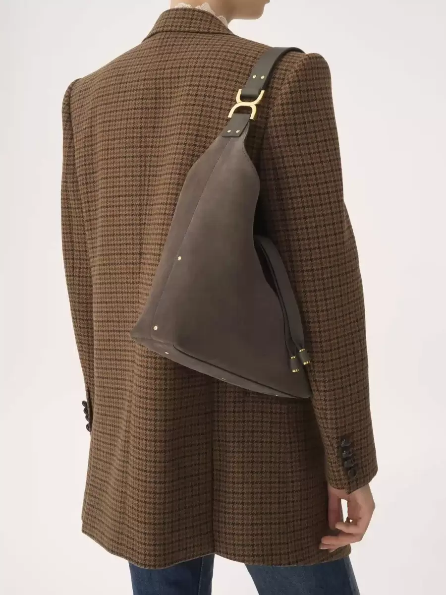 This small Marcie hobo bag has a slouchy, minimalist silhouette. Crafted from suede calfskin, it features a tone-on-tone studded handle embellished with the line’s iconic gold-tone metallic piece. Signature leather tassels secure its calfskin interior.