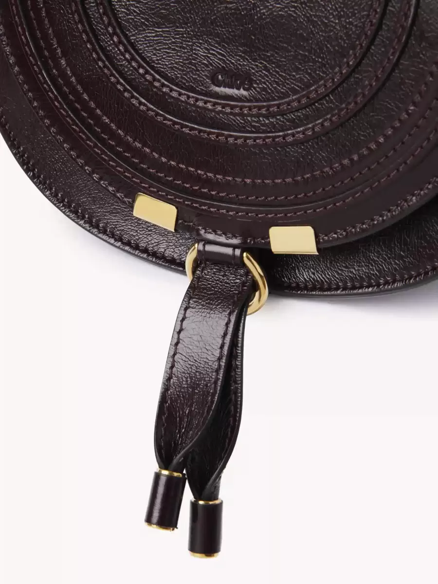 This small Marcie saddle bag is crafted from shiny calfskin with a rounded silhouette and a clean top line. The flap features the line’s iconic saddle stitching, secured with signature dangling leather tassels.