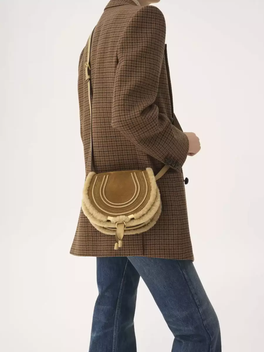 Crafted from suede calfskin with shearling trims, this small Marcie saddle bag pairs a rounded silhouette with a clean top line. The flap features the line’s iconic saddle stitching, secured with signature dangling leather tassels.