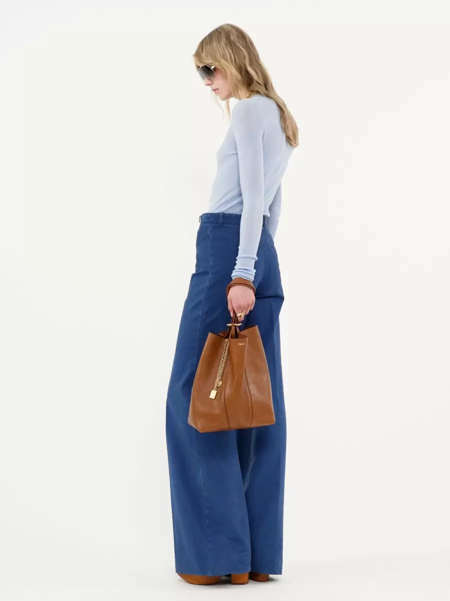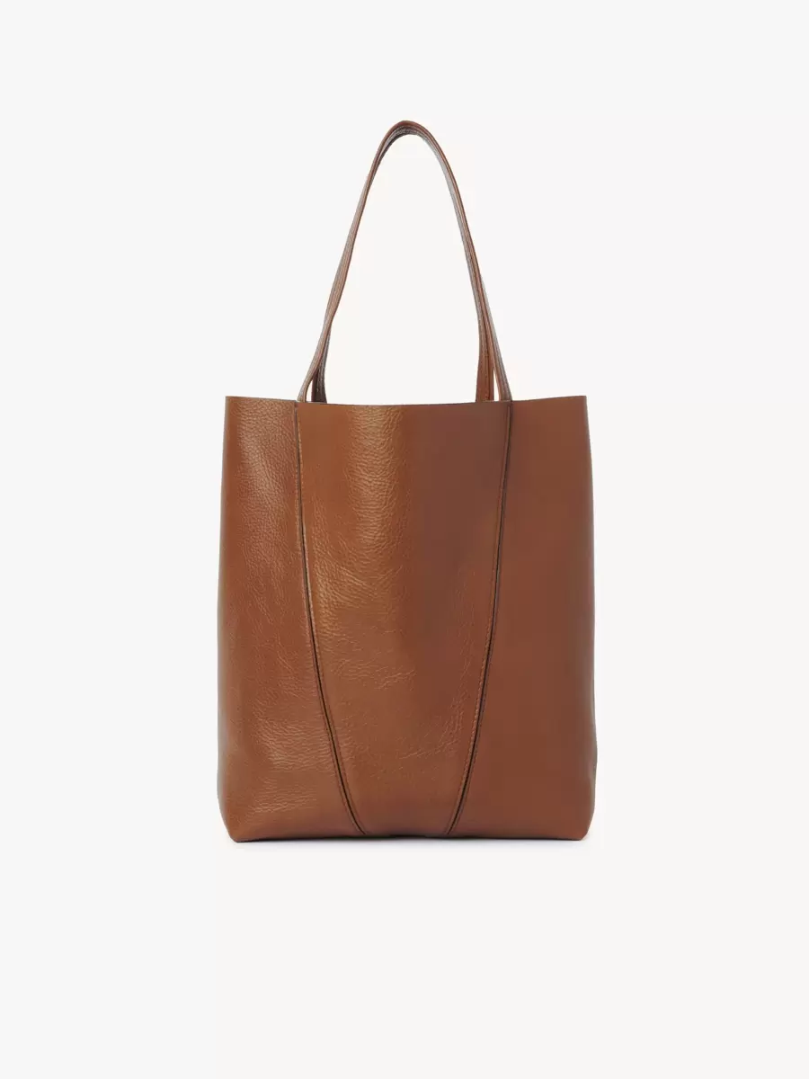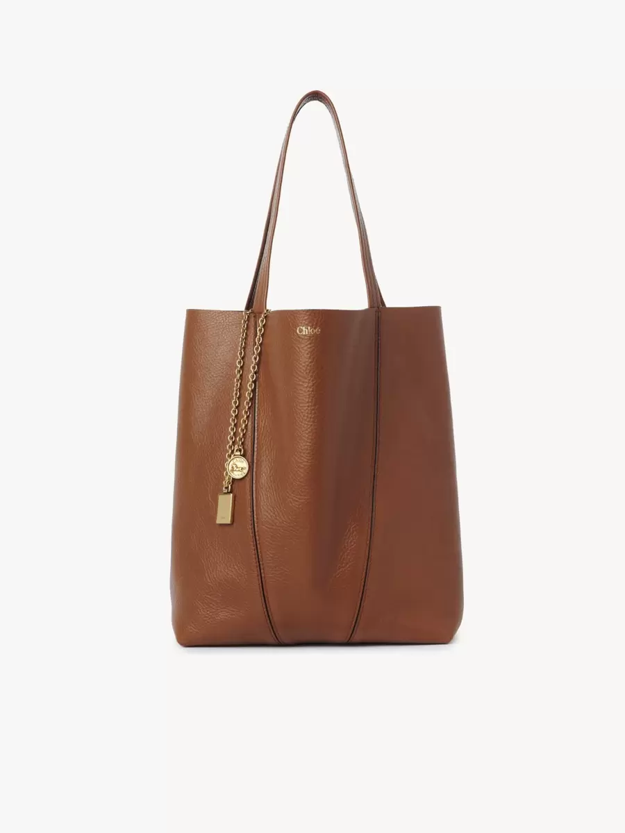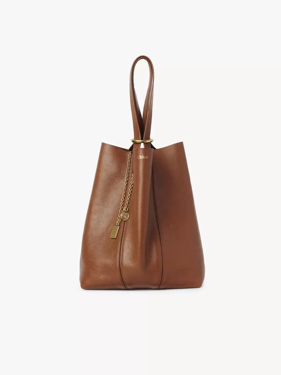 Crafted from shiny grained cowhide, the Chloé Spin tote bag has a minimalist silhouette elevated with graphic lines. A dangling chain features the Maison’s signature Chloé and Horse Medals.