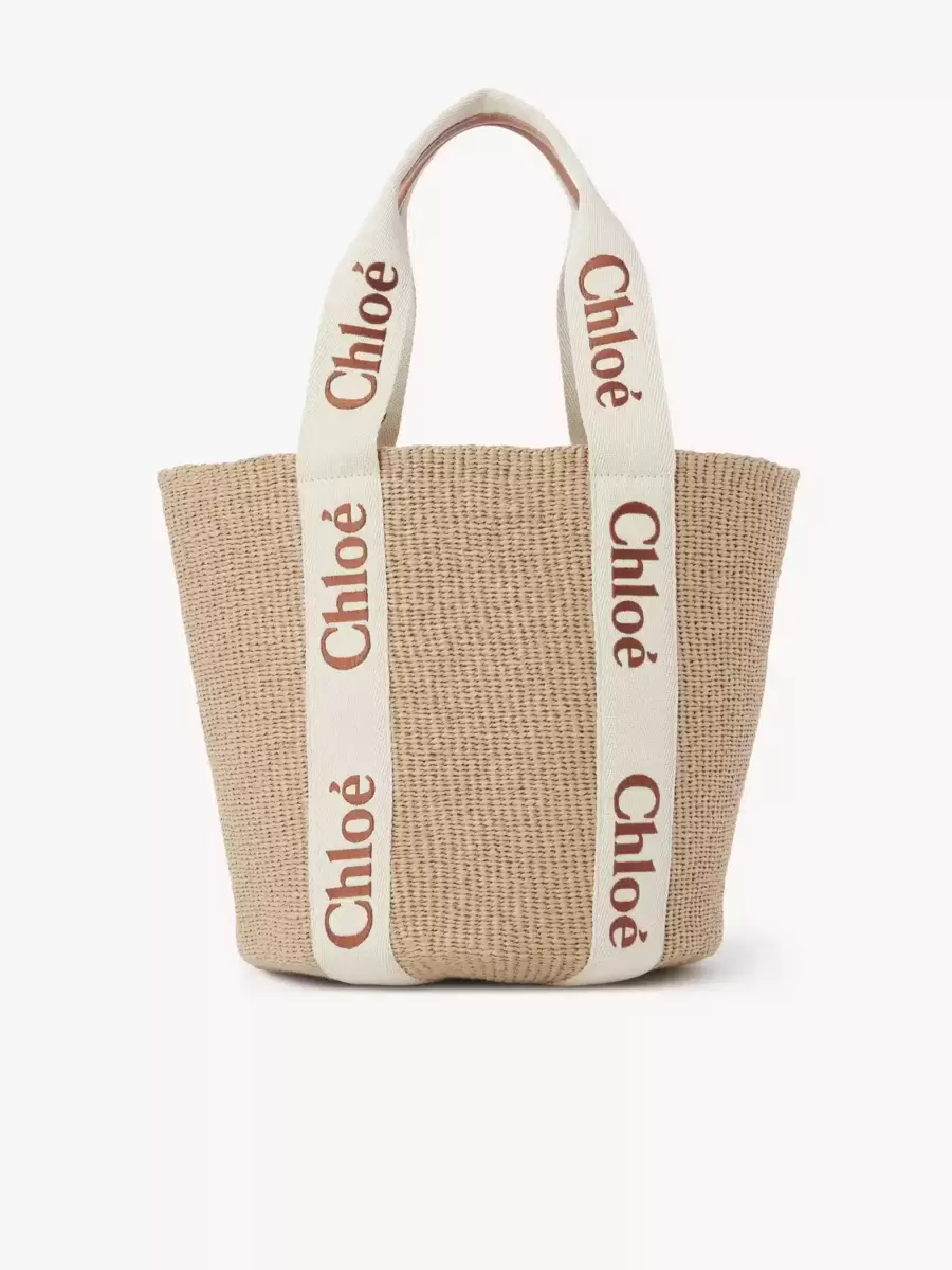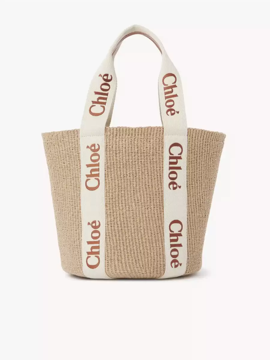 Large Woody basket bag in fair-trade paper, calfskin & polyester webbing with Chloé logo embroidery