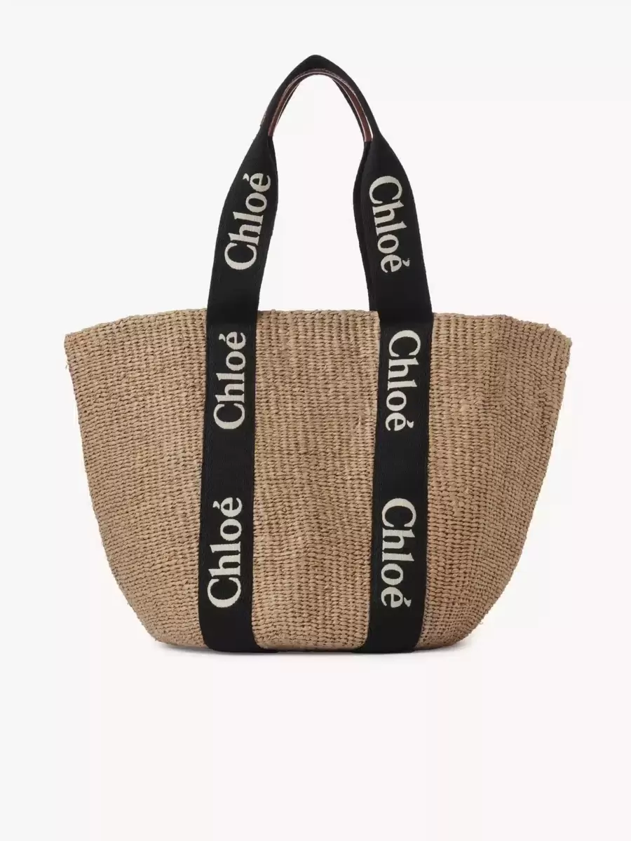 Crafted in a timeless basket shape for an effortless summer mood, this large Woody basket is handwoven by independent craftswomen in Kenya. Embroidered Chloé logo webbing details the natural fiber for graphic contrast and a signature touch. The bottom of the basket is protected by a Chloé-embossed round leather patch for durability.