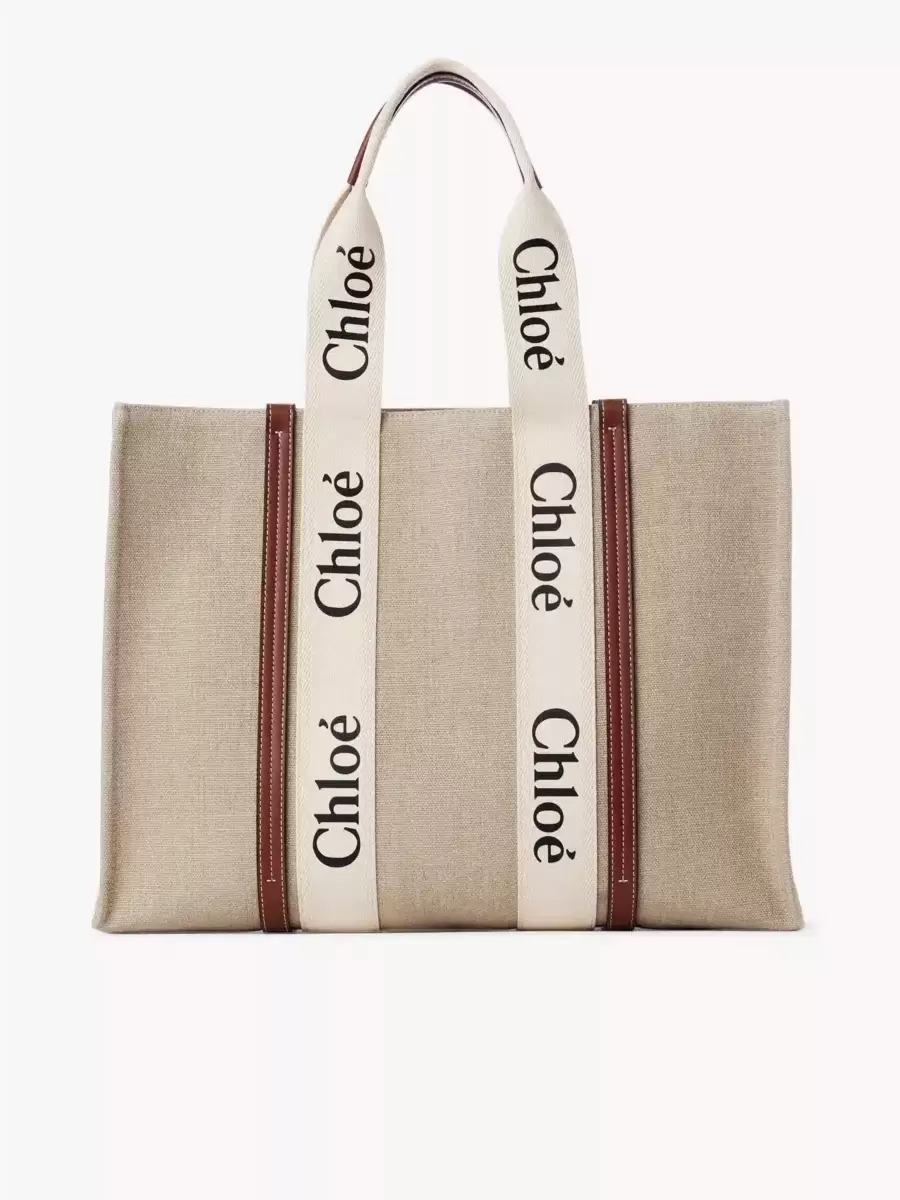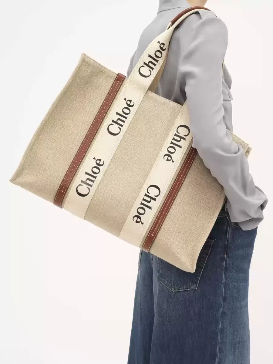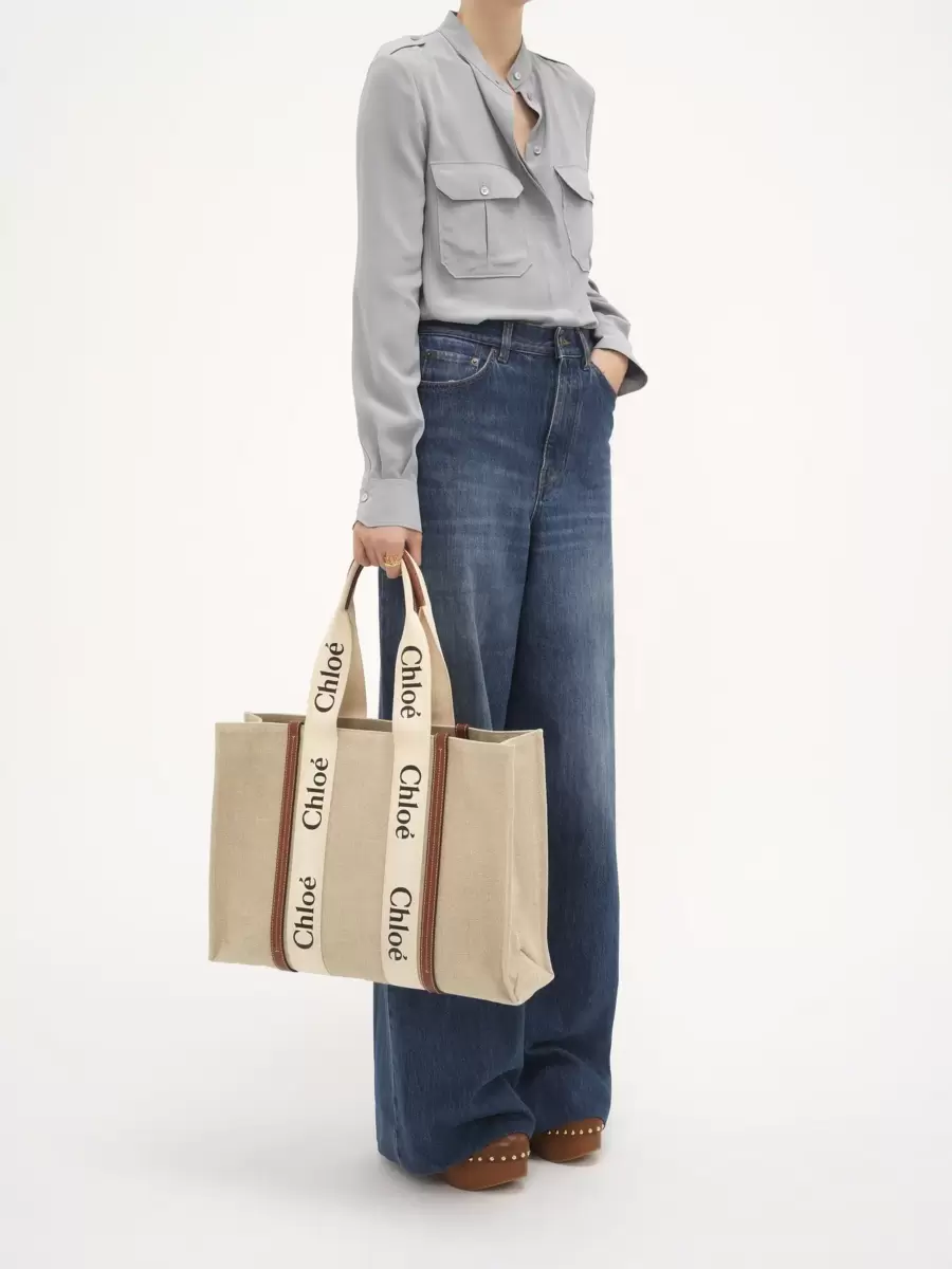Crafted from lower-impact linen canvas detailed with shiny calfskin strips, this large Woody tote bag is a spacious bag with a strong summer attitude. The roomy inside compartment includes a practical flat pocket.