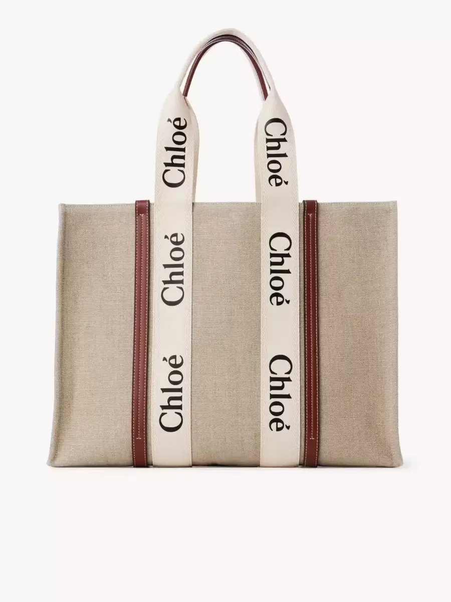 The bag’s sharp, modern lines are emphasized by the contrasting vertical leather strips and the signature Chloé logo ribbon carried over from the Maison’s Woody mule. Carry this tote bag comfortably on the shoulder.