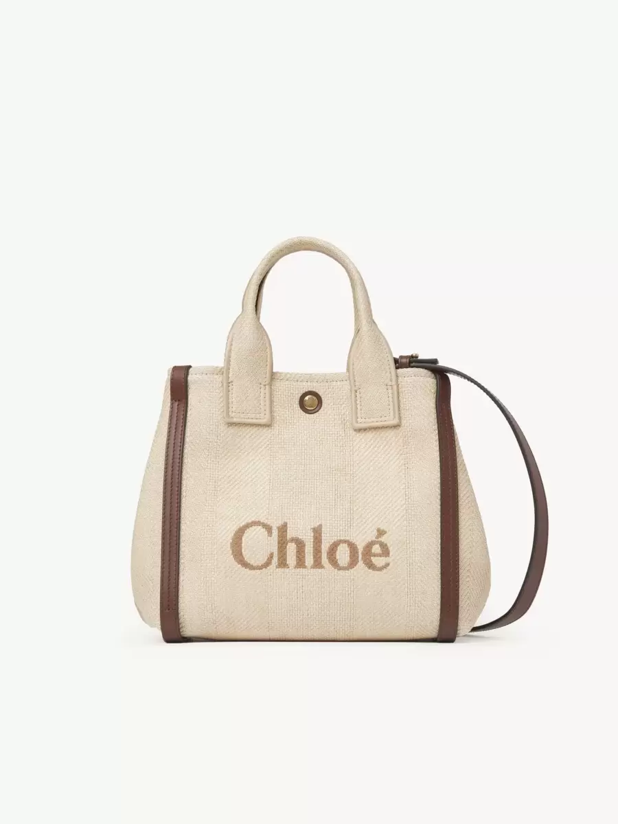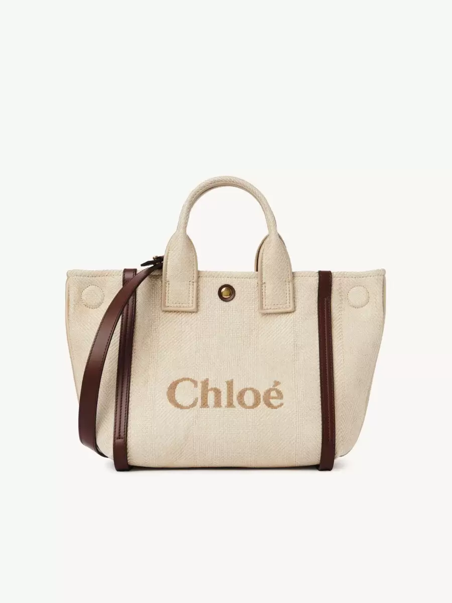 This small Chloé Carry tote bag is crafted from striped raffia-effect fibers, complemented by contrasting vertical leather bands and an oversized Chloé logo.