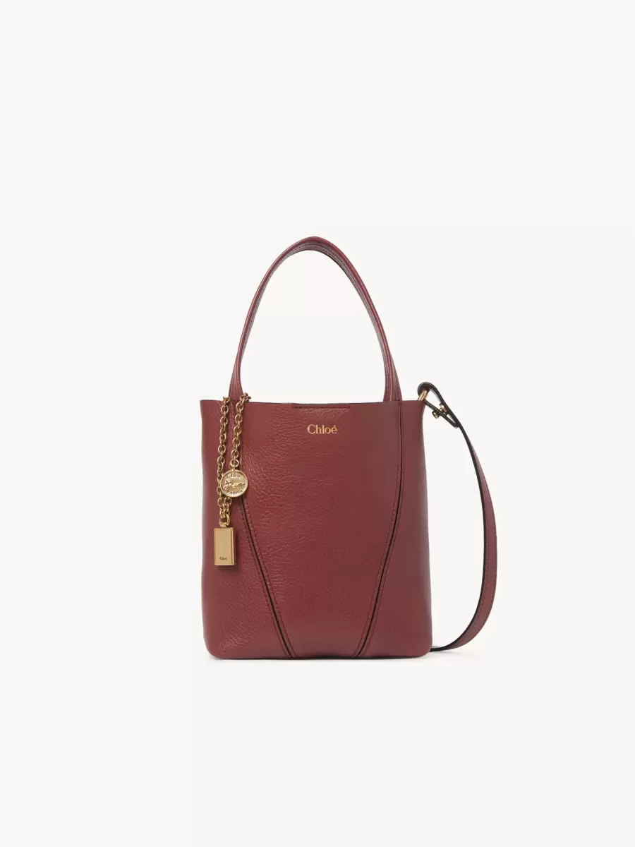 Crafted from shiny grained cowhide, the small Chloé Spin tote bag has a minimalist silhouette elevated with graphic lines. A dangling chain features the Maison’s signature Chloé and Horse Medals.